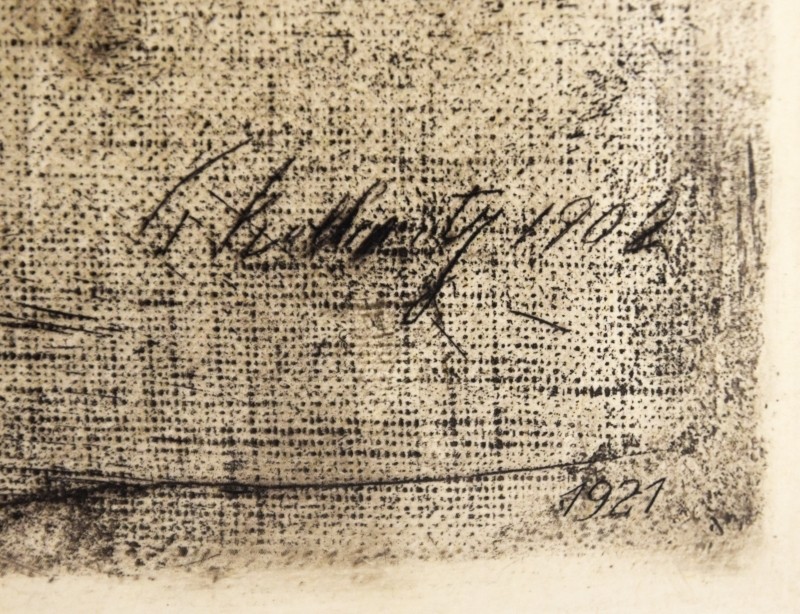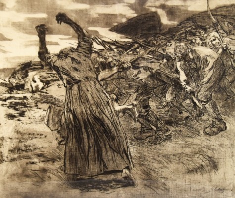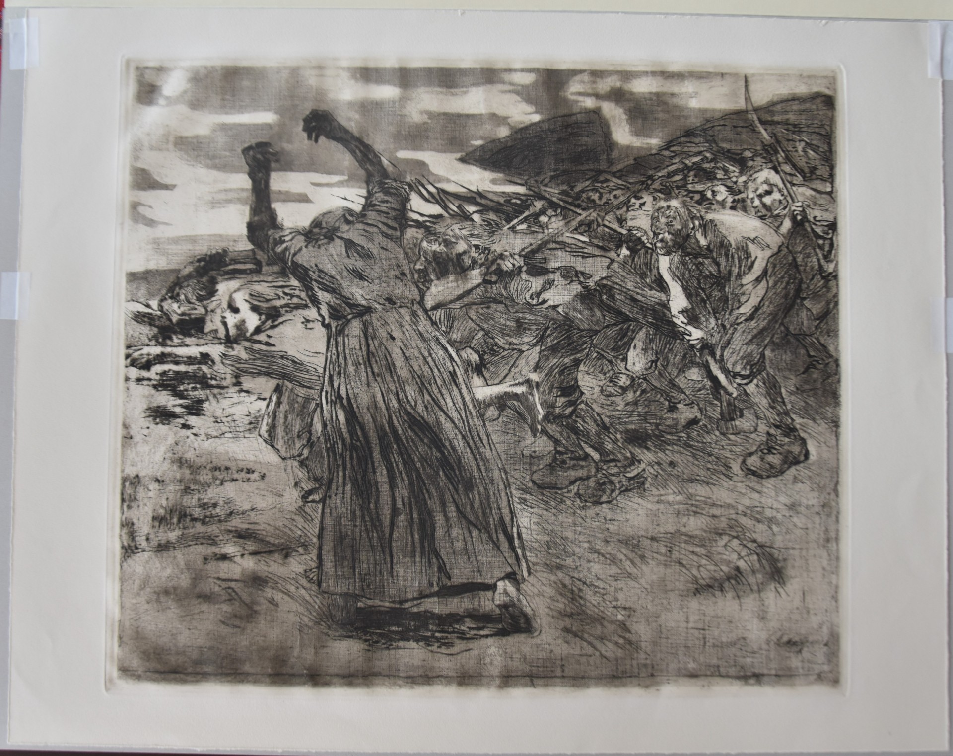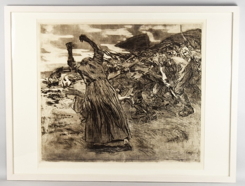 KOLLWITZ Käthe (1867 Königsberg - 1945 Moritzburg) ''Losbruch'', im Vordergrund eine Bäuerin in Rückansicht, die Arme nach oben reißend, im Mittelgrund nach links zum Kampf stürmende, bewaffnete Bauern, Radierung, rechts unten in der Platte signiert und datiert 1902, weiter unten rechts ein weiteres mal in der Platte datiert 1921, 59x51cm, PP; *Es handelt sich um das Blatt 5 aus dem Zyklus »Bauernkrieg«, den Käthe Kollwitz zwischen 1901 und 1908 schuf. In ''Losbruch'' (1902/1903) stellt Kollwitz die Erstürmung des Weinsberg dar. Zentral ins Bild setzt sie die sogenannte ''schwarze Hofmännin'', als Rückenfigur. Als eine der wenigen historisch belegten Frauengestalten des Bauernkrieges, kämpfte sie zwar selbst nicht mit, doch rief sie die Bauern zum Kampf auf - wie es auch Kollwitz darstellt. Die Künstlerin selbst bezeichnet das Blatt »Losbruch« in einem Brief von März 1903 als ihre »beste Arbeit« bis zu dieser Zeit. Ende 1902 stellt sie die Radierung, die erste fertige Arbeit des Bauernkrieges, bei der Berliner Secession aus.*