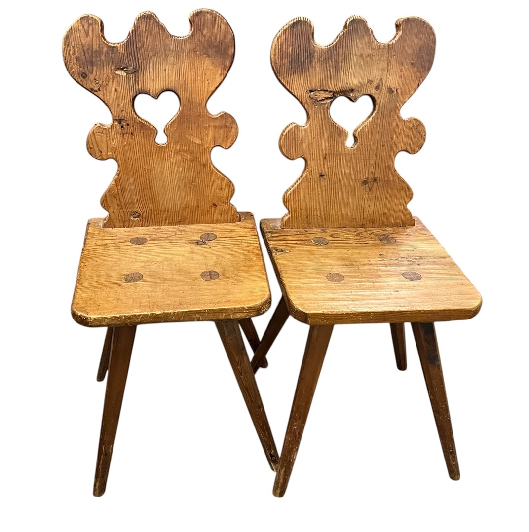 Bauernhausstühle, zwei Stück, Weichholz. Ausgelassenes Herz in der Rückenlehne.
