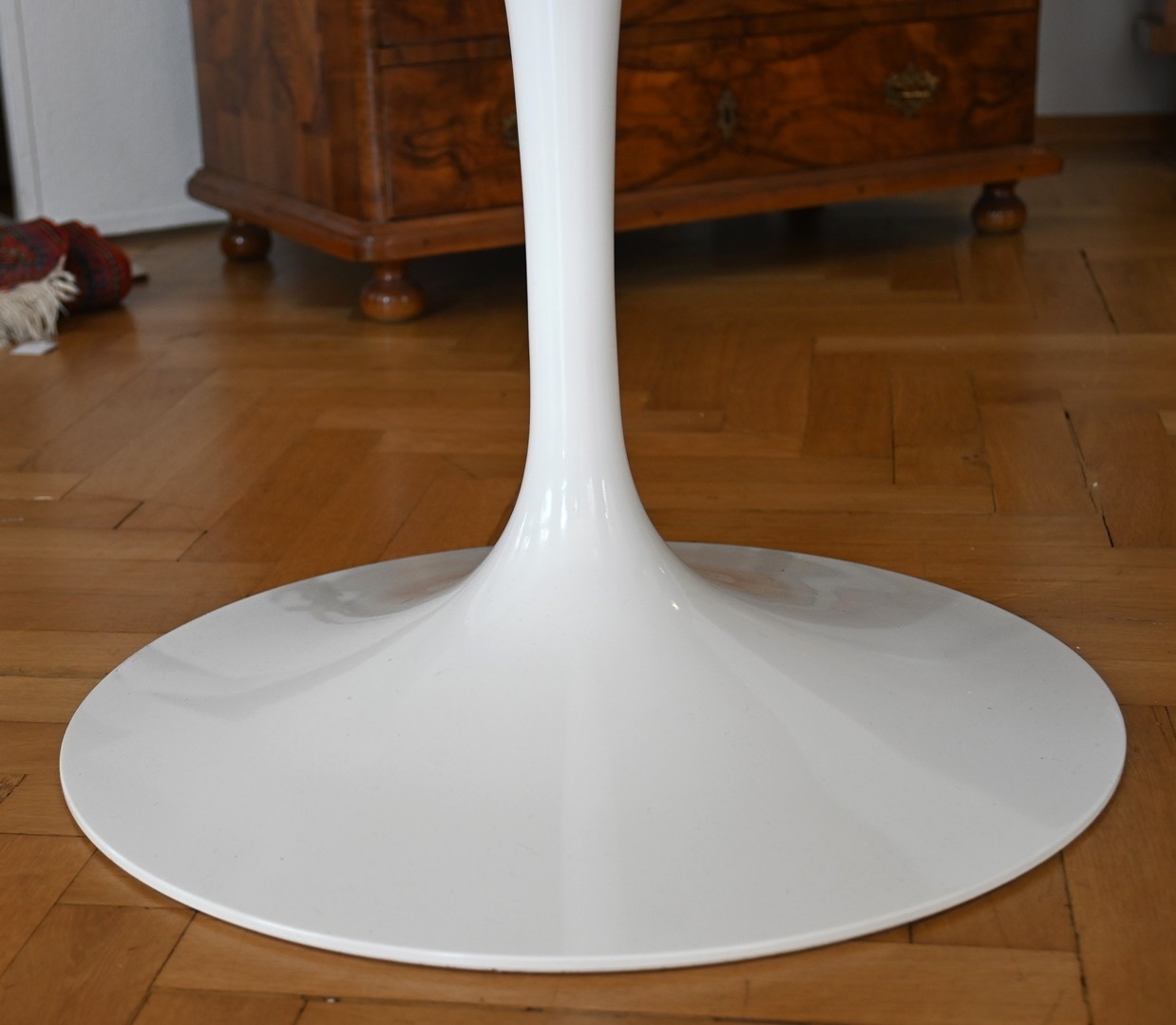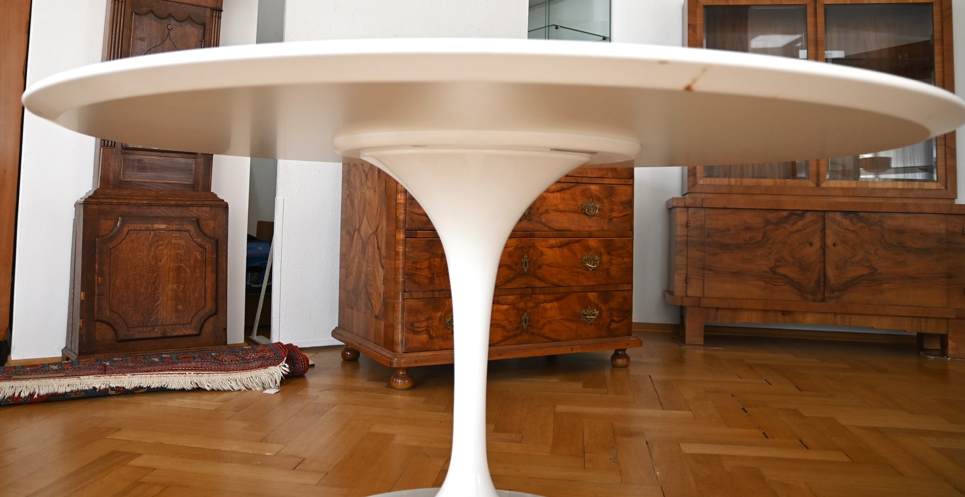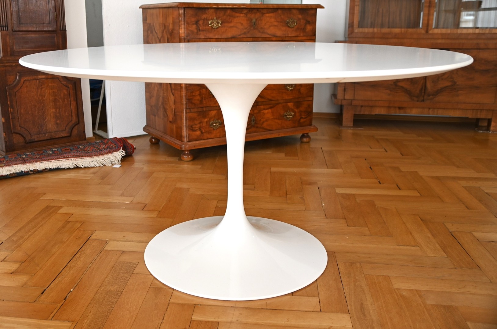 Los 265 - Esstisch Knoll International von Eero Saarinen, runder Tisch mit Platte aus der "Tulip Collection", Entwurf 1956 vom finnischen Designer Eero Saarinen (1910-1961) für KNOLL Inc., Tischhöhe 72 cm, ovale, weiß laminierte Platte mit einem Durchmesser von 136 cm, sehr guter Gesamtzustand