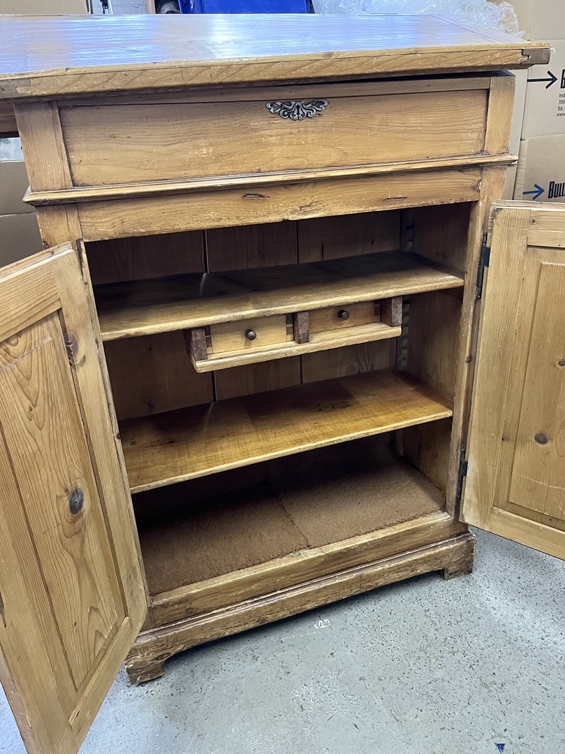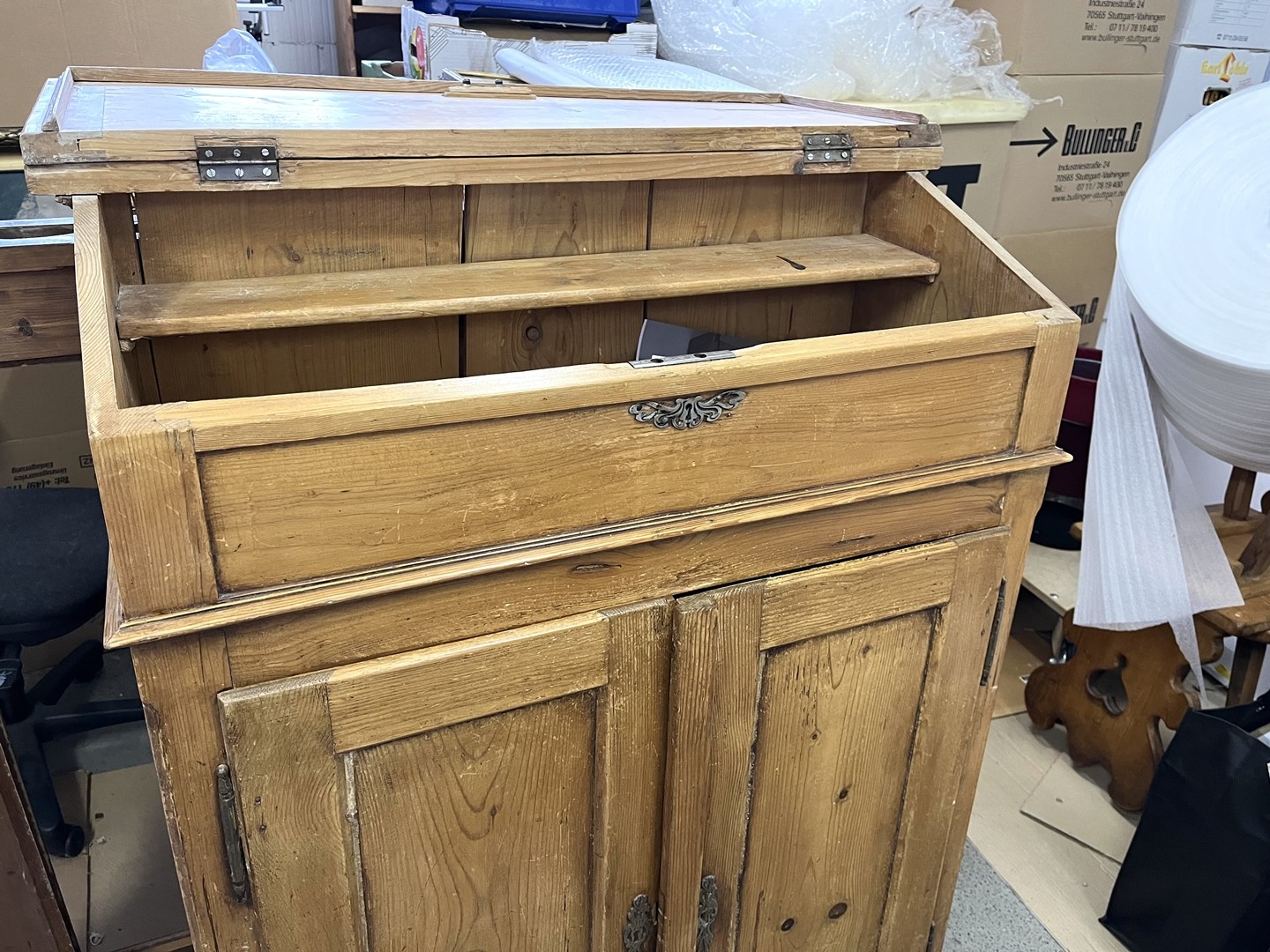 Stehpult mit Klappe, Weichholz.unten/hinten für z.B. Sockelleiste ausgesägt, Sockelholz lose, altersbedingte Abnutzung, ohne Schlüssel, Schloss antik.