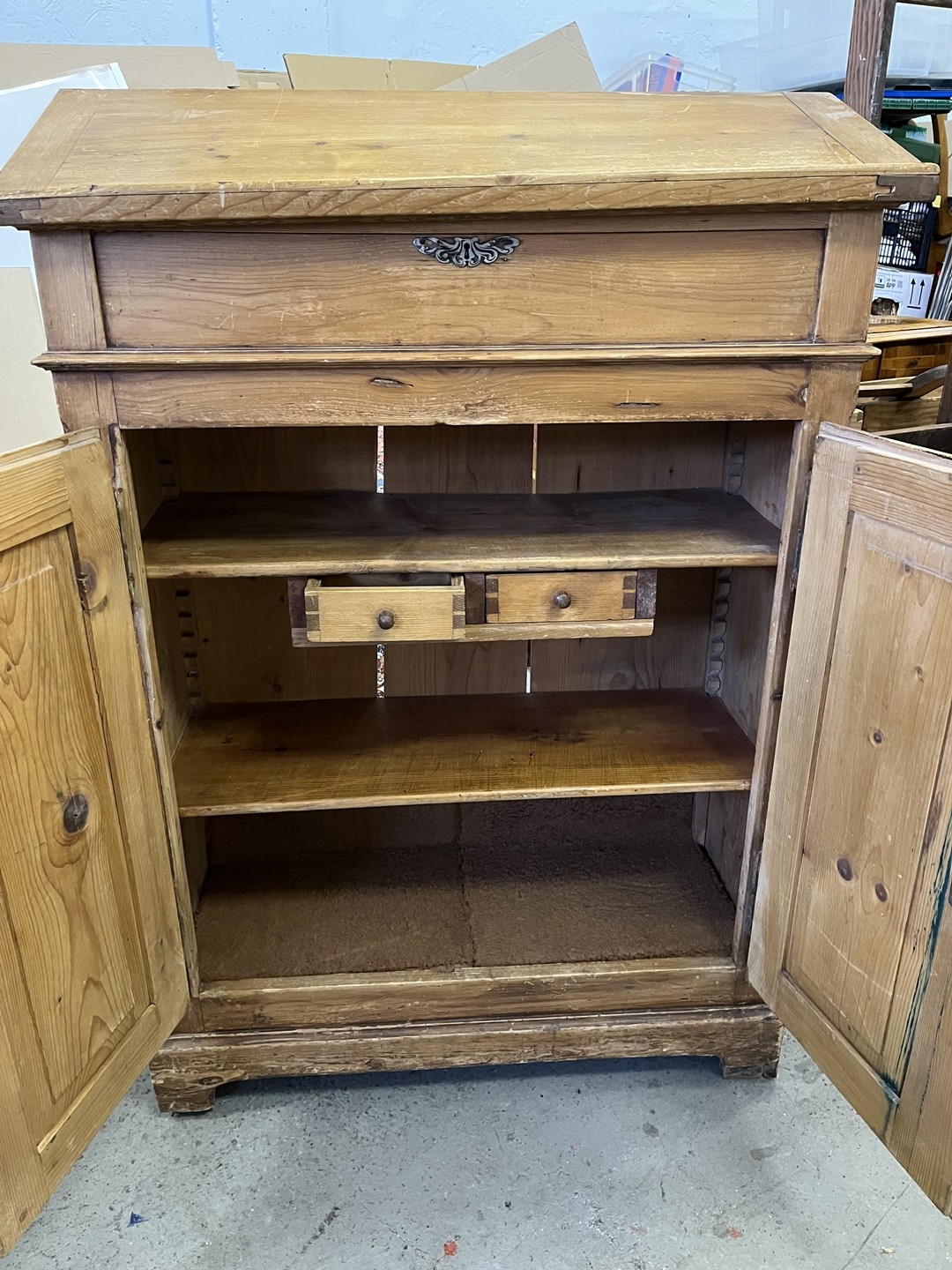 Los 109 - Stehpult mit Klappe, Weichholz.unten/hinten für z.B. Sockelleiste ausgesägt, Sockelholz lose, altersbedingte Abnutzung, ohne Schlüssel, Schloss antik.