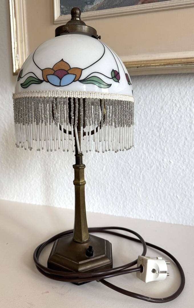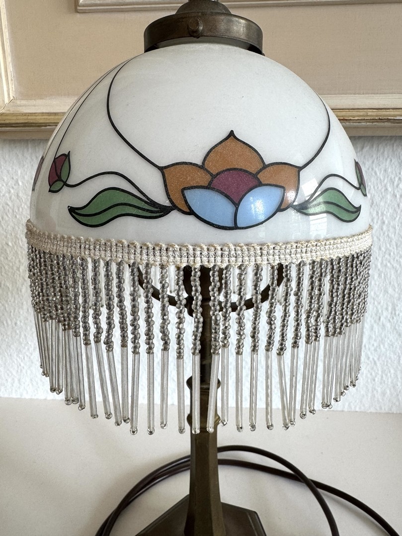 Die eng mit dem Jugendstil verbundene Lampe verleiht dem Raum auf den ersten Blick eine elegante und kunstvolle Atmosphäre. Auf dem oberen Lampenschirm ist ein florales Blumenmuster zu erkennen, welches durch transparente Perlenfransen am unteren Rand vervollständigt wird.