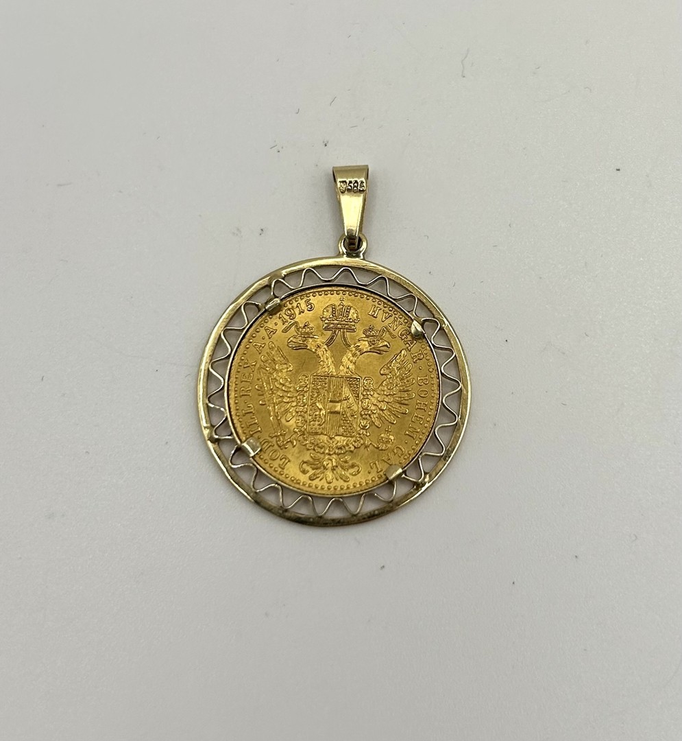 Los 145 - Medaille-Anhänger, "Wolfgang Amadeus Mozart", Fassung 585 Gelbgold, Dukat 916 Gelbgold. Auf einer Seite ist er im Profil abgebildet, auf der Rückseite die Lebensdaten von Mozart mit der Abbildung Salzburgs.