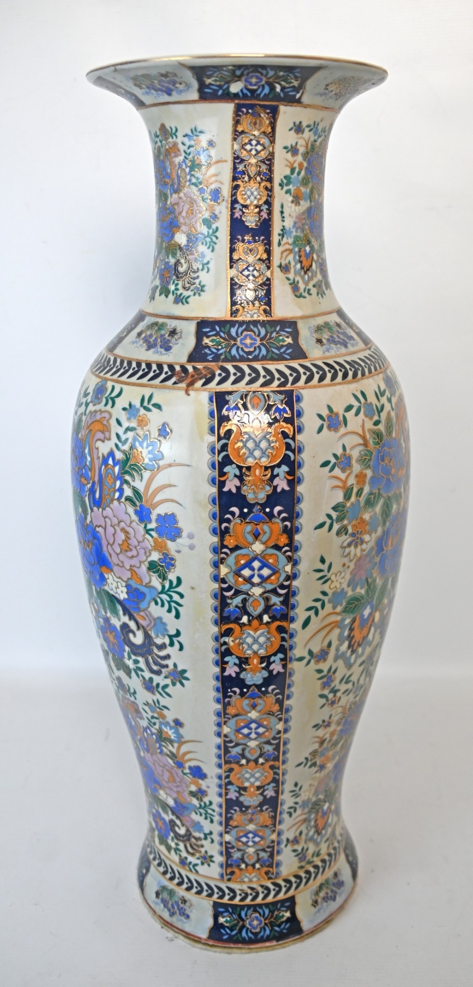 BODENVASE um die Schulter geweitet, ausgestellter Rand, Wandung mit farbigem Blumenmotiv und Goldleisten auf weißem Porzellan, H 61cm