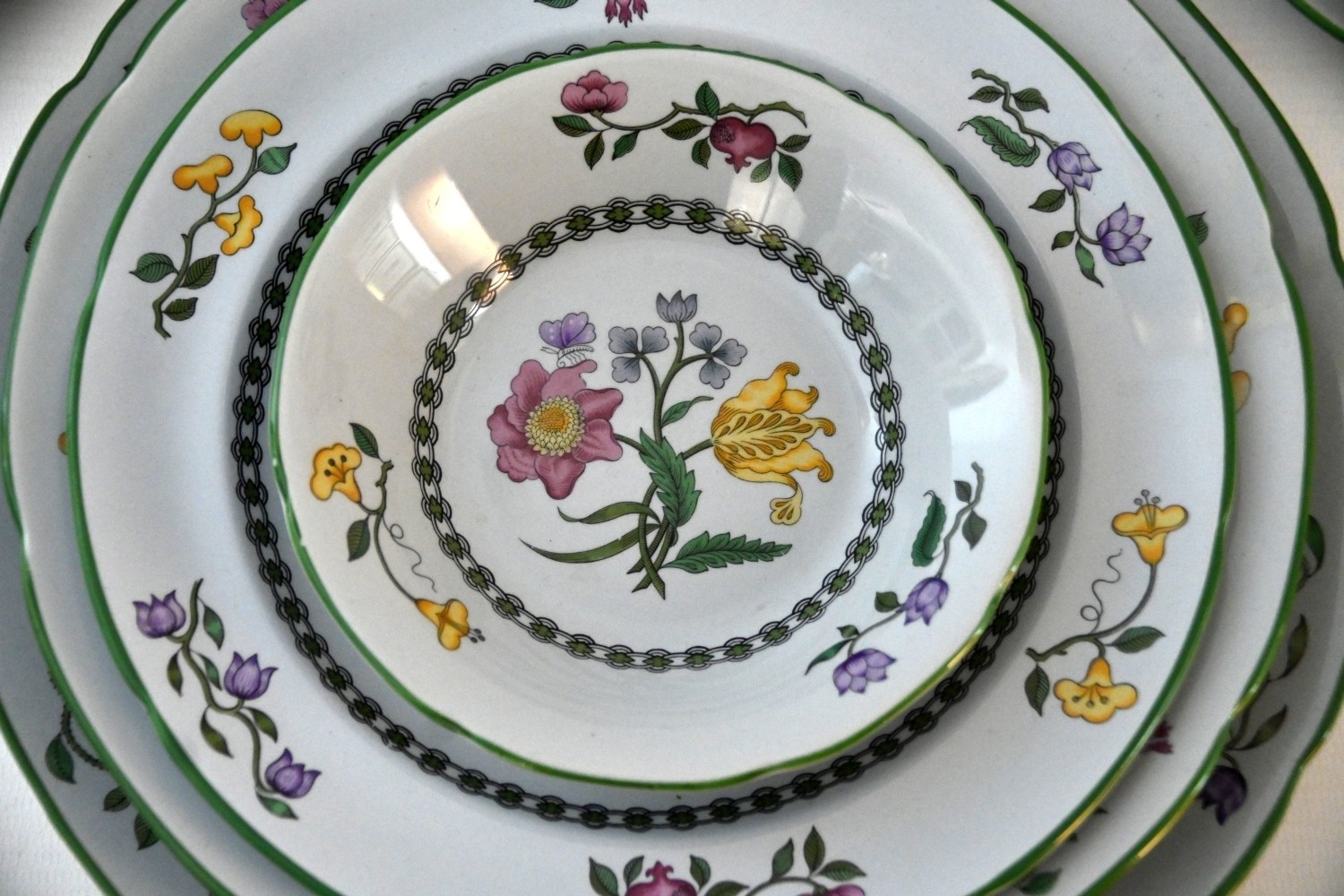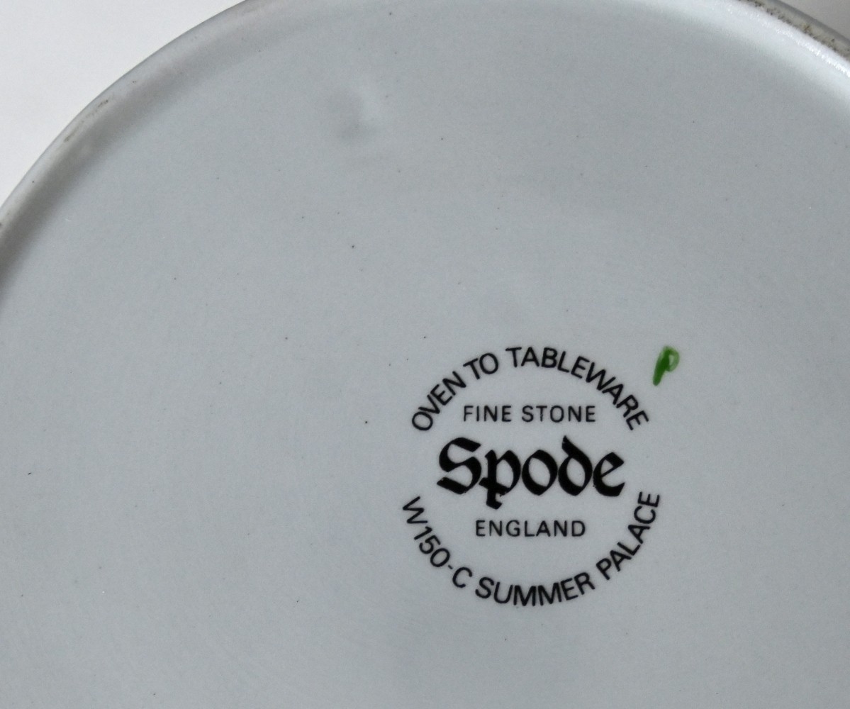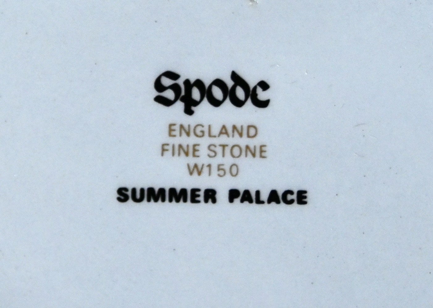 GROSSES SPODE SERVICE ''Summer Palace'', dekoriert mit farbigem stilisiertem Blütenarragement auf Hellgrau: 15 Speiseteller, 8 tiefe Teller, 14 Vorspeiseteller, 6 Suppentasssen mit Tellern, 10 flache Dessertschalen, 10 kleine, tiefe Schalen, 1 Sauciere, 2 Deckelterrinen, 1 viereckige Gemüseschüssel, 2 Vorlegeplatten, 1 Butterdeckeldose, Milch-Zucker auf Tablett, 1 Henkelkanne, 6 Kaffeetassen/4 Untertassen, 5 Teetassen, gesamt 89 Teile in gutem gebrauchtem Zustand, England 20. Jh.