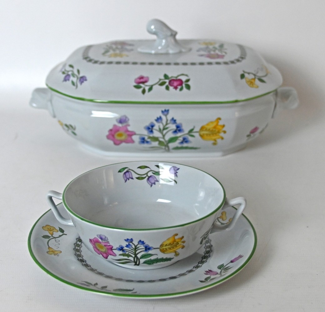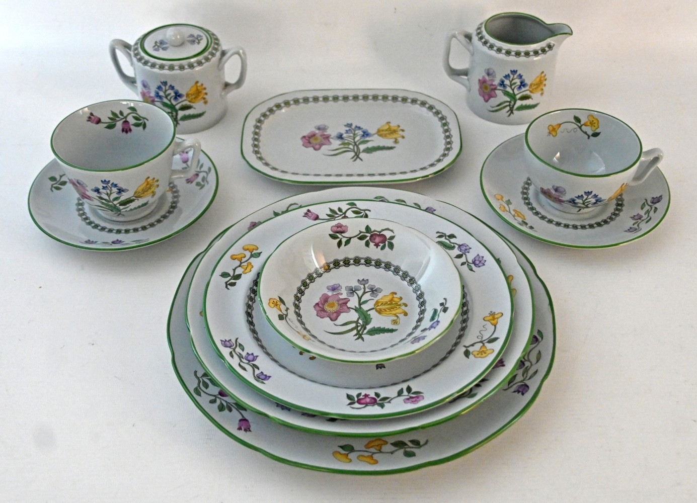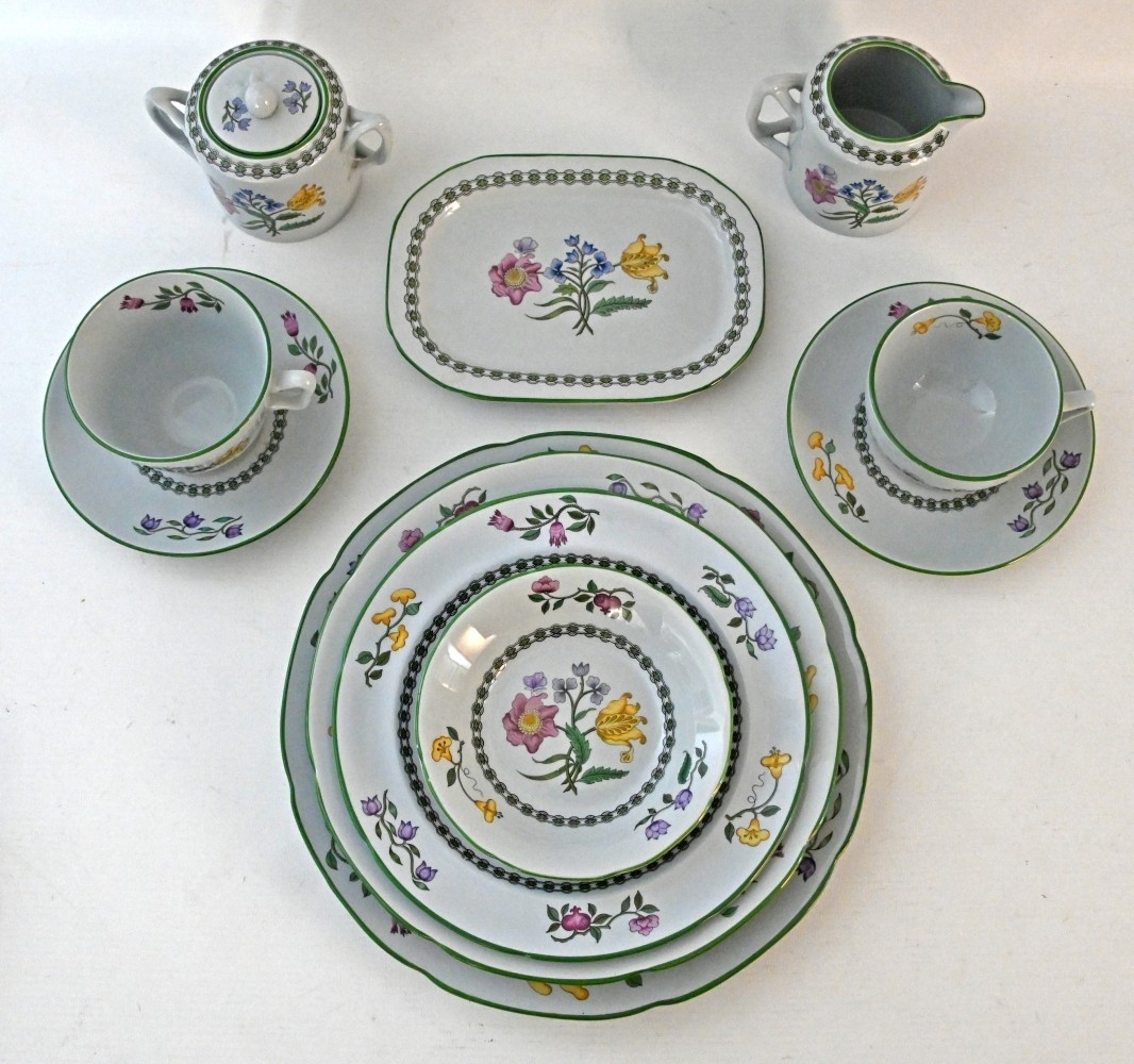 GROSSES SPODE SERVICE ''Summer Palace'', dekoriert mit farbigem stilisiertem Blütenarragement auf Hellgrau: 15 Speiseteller, 8 tiefe Teller, 14 Vorspeiseteller, 6 Suppentasssen mit Tellern, 10 flache Dessertschalen, 10 kleine, tiefe Schalen, 1 Sauciere, 2 Deckelterrinen, 1 viereckige Gemüseschüssel, 2 Vorlegeplatten, 1 Butterdeckeldose, Milch-Zucker auf Tablett, 1 Henkelkanne, 6 Kaffeetassen/4 Untertassen, 5 Teetassen, gesamt 89 Teile in gutem gebrauchtem Zustand, England 20. Jh.