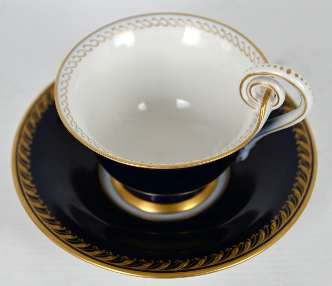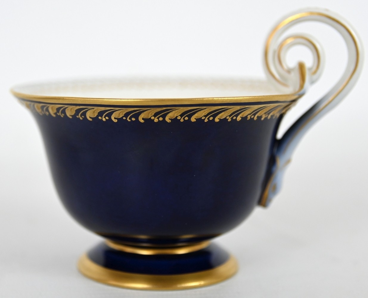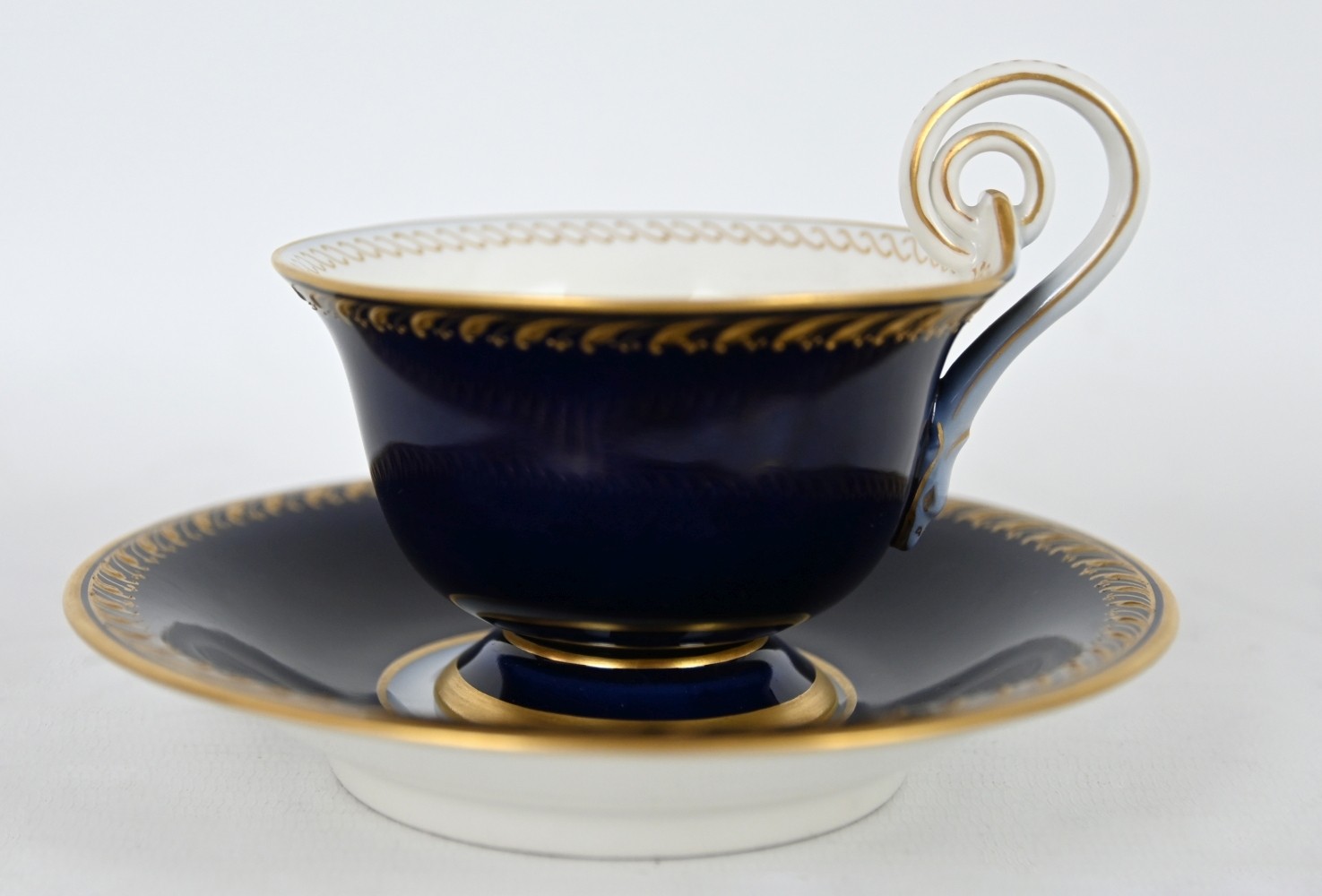 JUBILÄUMSTASSE KPM 1763-1913, Tasse mit Schlangenhenkel, Untertasse, in Kobalt mit Goldstaffage, Zeptermarke, roter Reichsapfel, gut erhalten