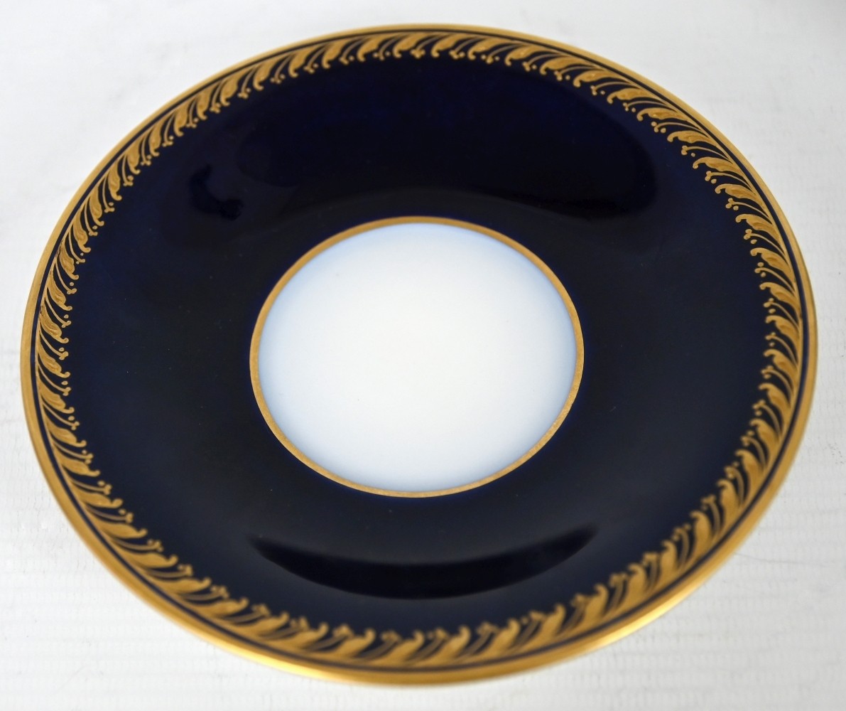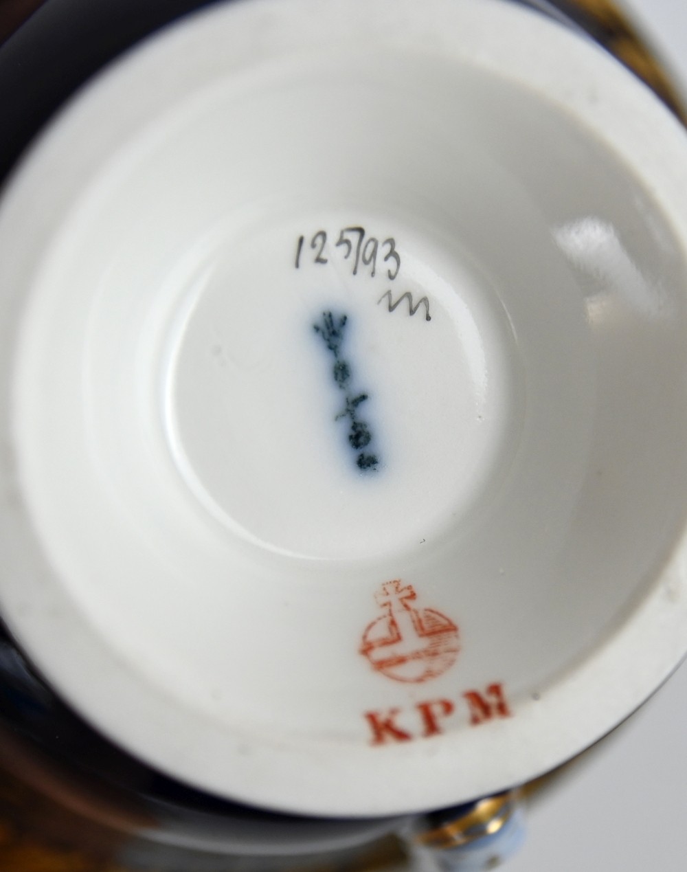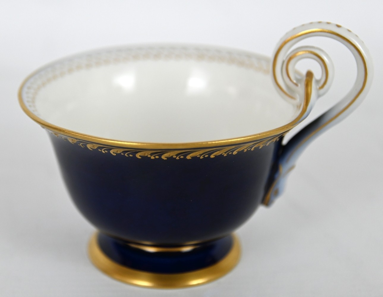 JUBILÄUMSTASSE KPM 1763-1913, Tasse mit Schlangenhenkel, Untertasse, in Kobalt mit Goldstaffage, Zeptermarke, roter Reichsapfel, gut erhalten