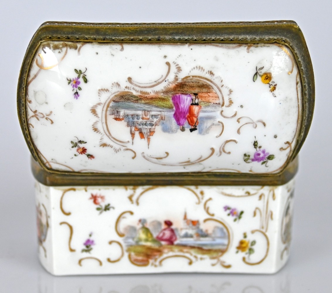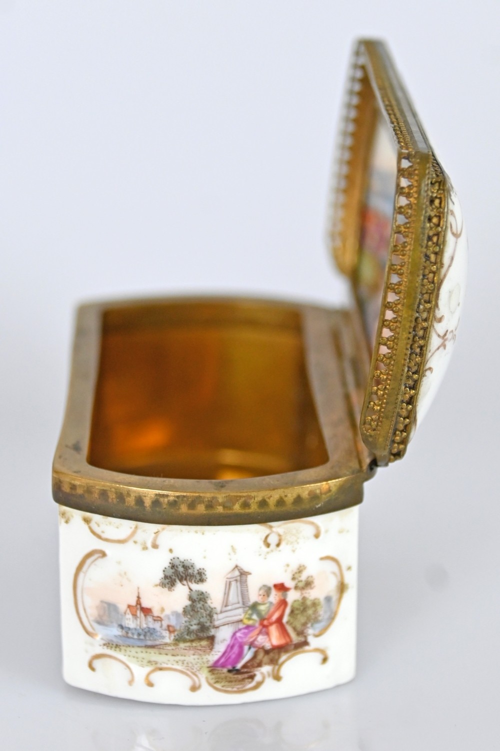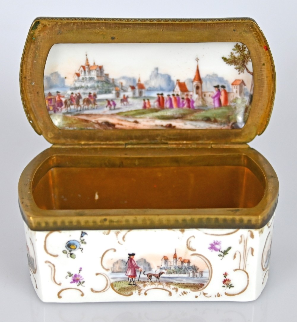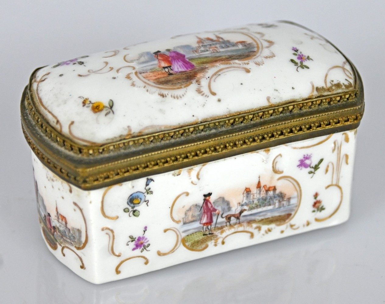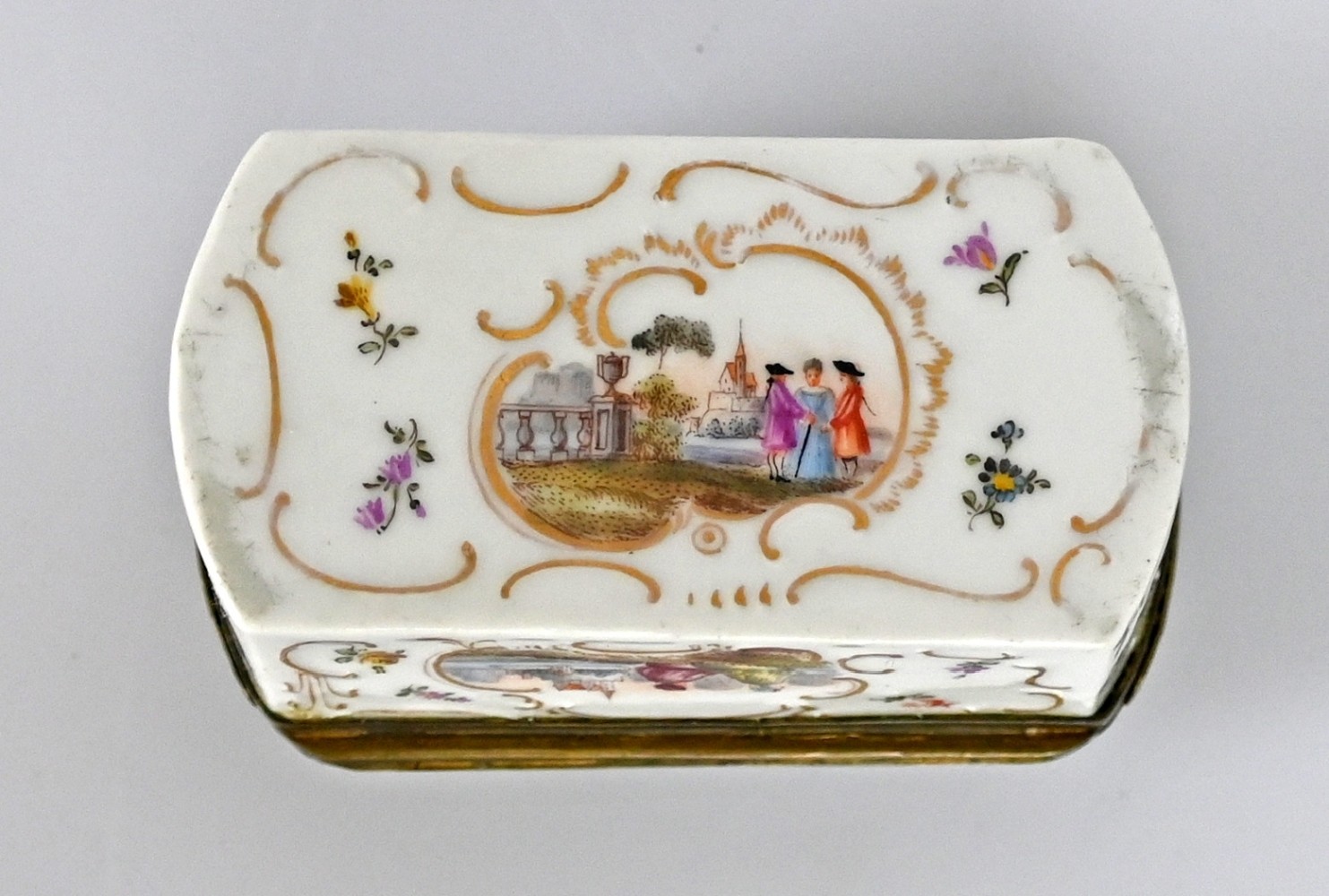 KLEINE DECKELDOSE Porzellan, allseitig und im Innendeckel feine Malerei mit Landschaftsmotiven und Personen in Goldkartuschen, weitere Dekoration mit Streublümchen und Goldrocaillen, vergoldete Messingmontur und Doseneinsatz, 19. Jh., H 4,5cm, B 8,5cm, T 4,5cm
