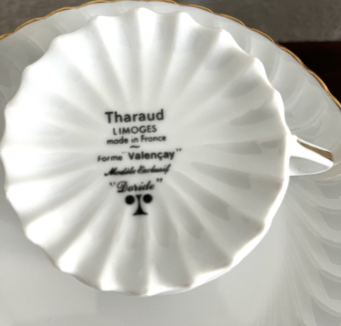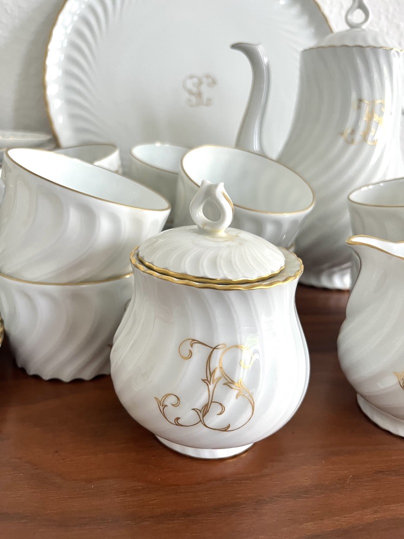 Limoges Tharaud Valencay "Doride", Kaffeeservice, für zwölf Personen. Enthält zwölf kleine Teller, zwölf Untertassen, zwölf Tassen, eine Kanne, ein Milchkännchen und eine Zuckerdose. Sehr selten genutzt, daher Goldrand ohne Beschädigungen. Kanne, Milchkännchen, Zuckerdose und Tassen monogrammiert mit IS.