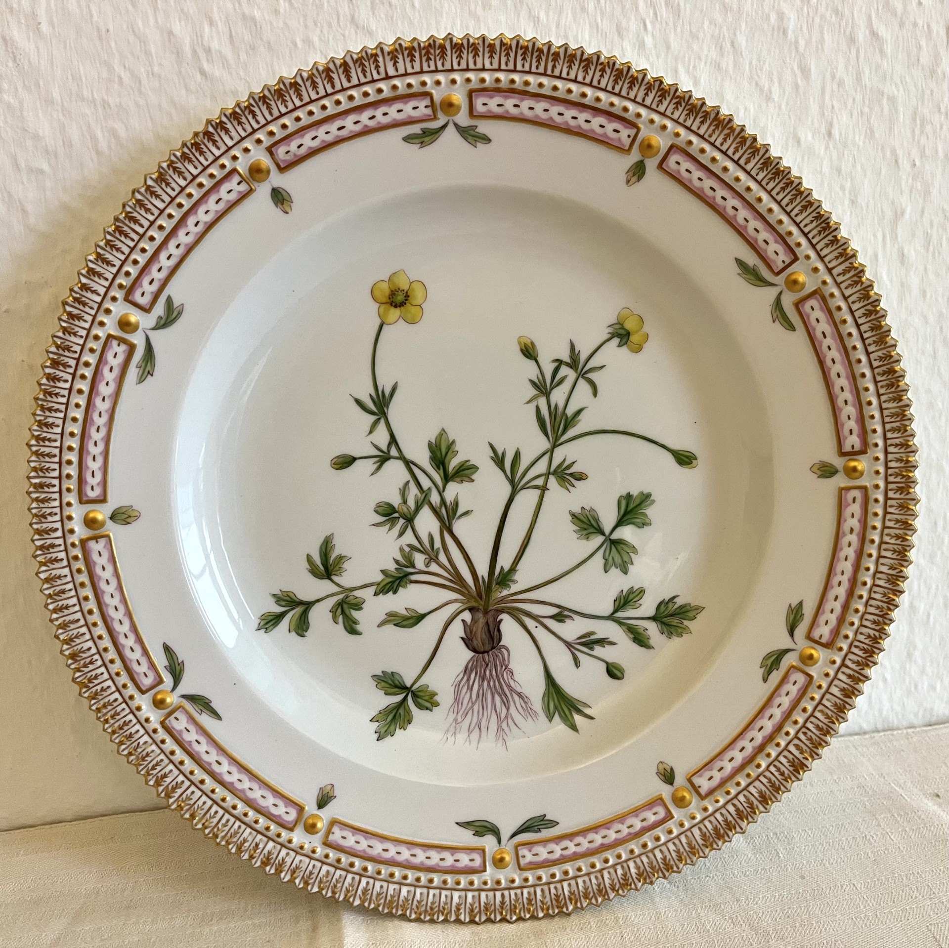 Los 51 - Royal Copenhagen, "Flora Danica", ein Speiseteller. Polychrom und goldstaffiert.