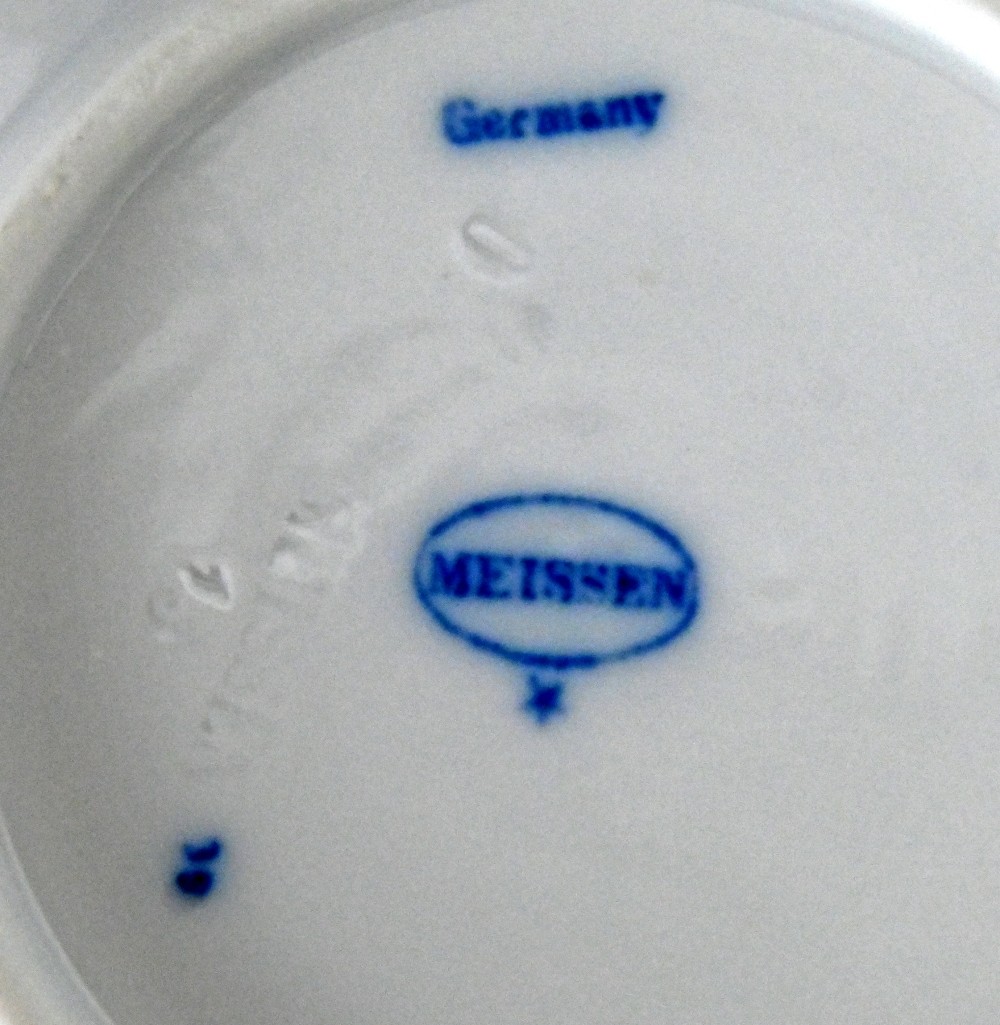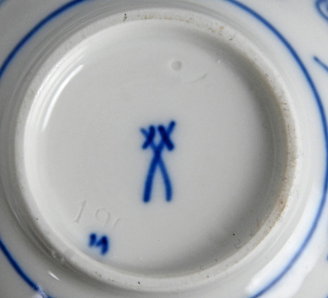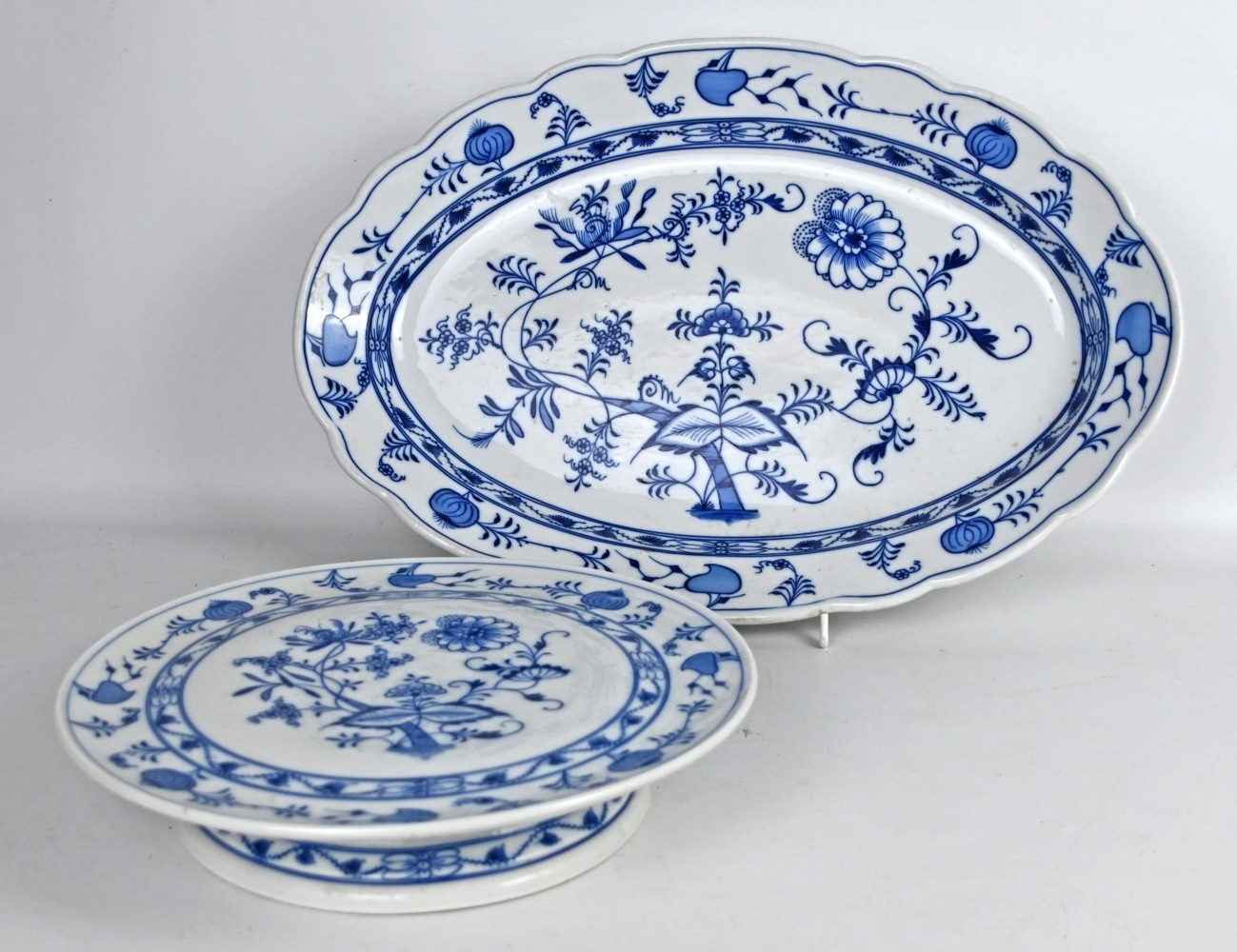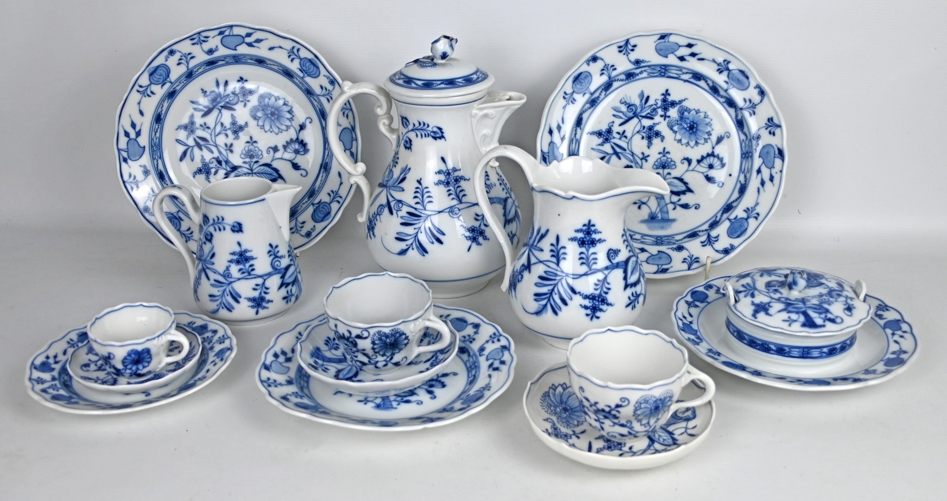 SPEISE-/KAFFEESERVICE im Zwiebelmuster, Bestand: Stadt Meissen/Teichert, 1. Hälfte 20. Jh.: fünf Speiseteller D 24,5cm, zehn tiefe Teller D 24,5cm, neun Speiseteller D 24,5cm (einer bestoßen), eine große ovale Vorlegeplatte D 48cm, eine Butterdose, sechs Vorspeise-/Kuchenteller D 20,5cm, vier Tassen mit Untertassen, Tortenplatte D 30cm, Kaffeekanne mit Röschen (am Deckel bestoßen), zwei Milchkannen, eine kleine Milchkanne, sechs Mokkatassen mit Untertassen (Zugabe: zwei Mokkatassen), vier kleine Teller D 16,5cm, Hermann Ohme, Niedersalzbrunn: eine große Gemüseplatte D 34cm Schwertermarke Meissen: zwei Tassen mit Untertassen, Zugabe: drei Eierbecher, ein Stövchen, eine kleine Salzschale in Muschelform *Das Service weist Gebrauchsspuren auf.*