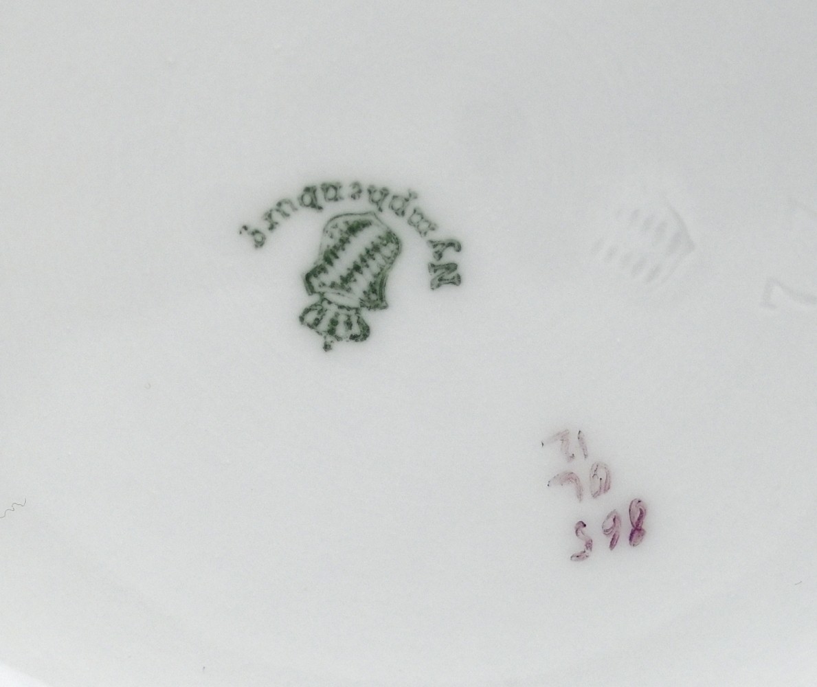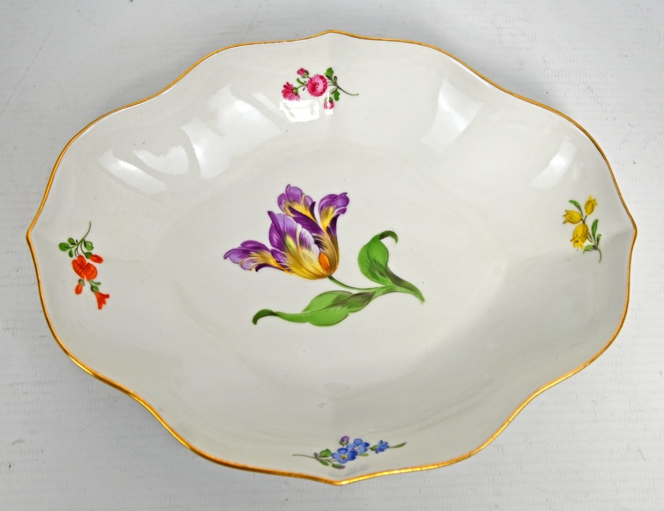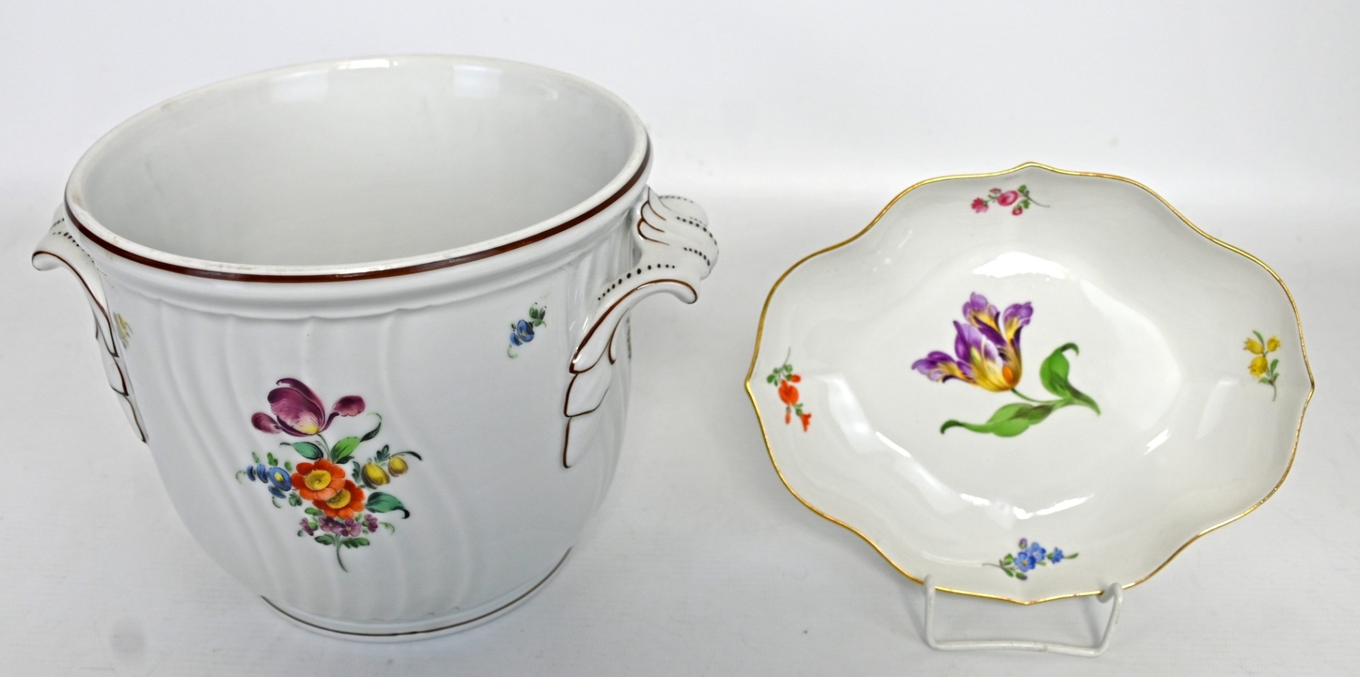 ÜBERTOPF Nymphenburg und SCHALE Meissen Übertopf mit seitlichen Handhaben, gerippter Wandung und Blütenbemalung, innen Gebrauchsspuren, H 16cm, B 24,5cm, dabei: geschwungene, leicht getiefte Schale mit Blütenbemalung und Goldrand, Schwertermarke Meissen, 18x15cm
