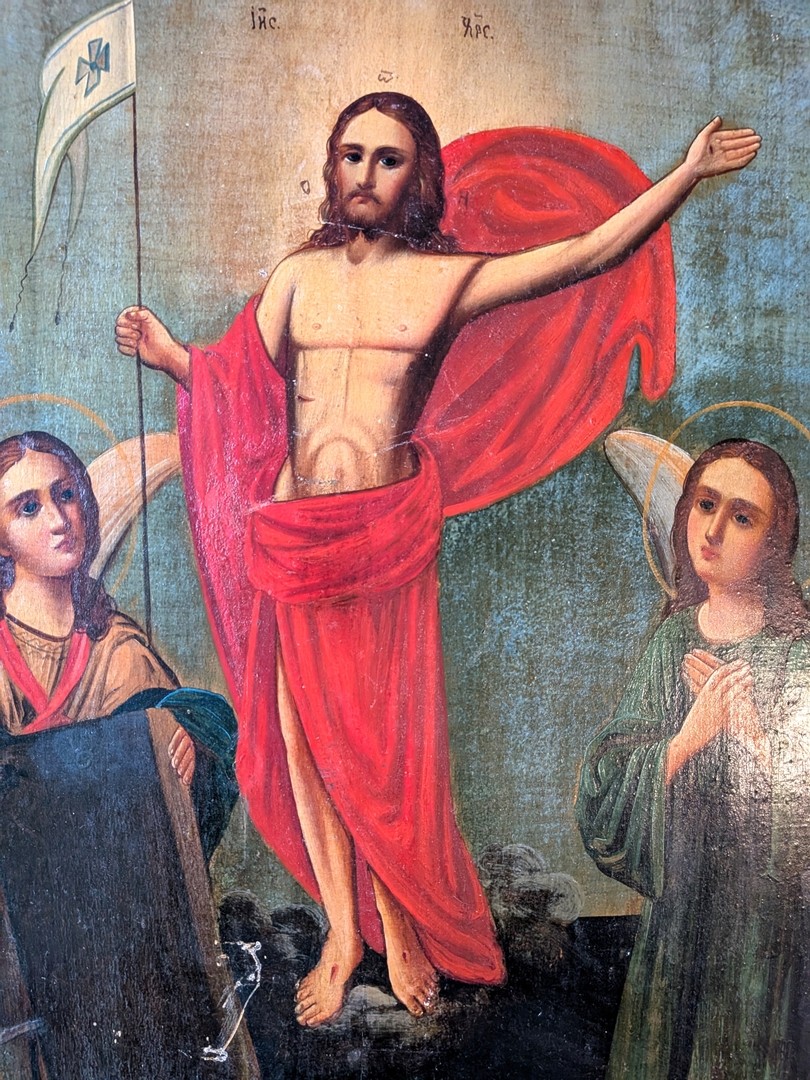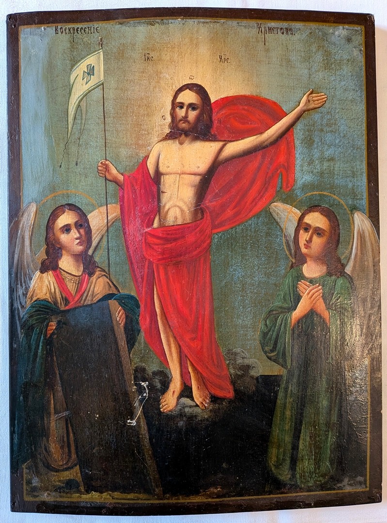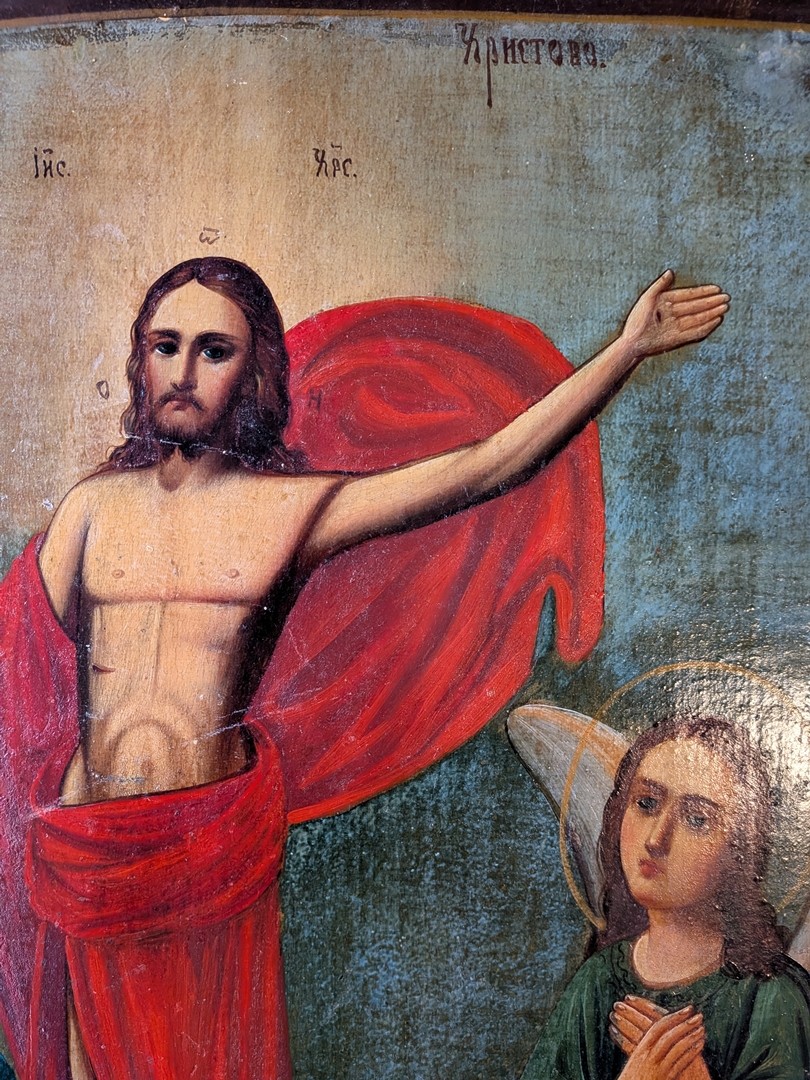 Auferstehung Christi, 19. Jahrhundert, russische Ikone. Die Ikone zeigt die Auferstehung Christi - eines der zentralen Feste und wichtigsten Themen der orthodoxen und christlichen Ikonographie. Im Zentrum erhebt sich der auferstandene Christus aus dem Grab, flankiert von zwei Engeln. Oben in kyrillischer Schrift steht: "Die Auferstehung Christi". Die Darstellung ist in Eitempera auf einem Holztafel ausgeführt. Der Stil ist volkstümlich-realistisch, mit sanfter Modellierung der Gesichter und einem deutlichen Übergang zwischen byzantinischer Tradition und westlich beeinflusster Malweise. Der hellgrüne Hintergrund ersetzt den traditionellen Goldgrund und deutet eine spätere Entstehung an, als naturalistischere Farben in der Ikonenmalerei aufkamen. Einige kleinere Abplatzungen und Kratzer sind zu sehen.