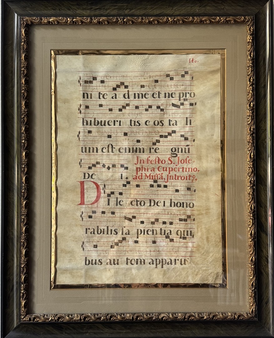 Die historische Seite zeigt einen lateinischen Text mit Noten, welcher aus einem Antiphonar stammt, welches die Gesänge für das Stundengebet der Kirche enthält. Die rote Schrift in der Mitte des Blatts erwähnt "In festo S.Joseph a Copertino, ad Missa, Introit", was auf einene Gesang für den Introitus der Messe am Festtag des Heiligen Joseph von Cupertino hindeutet. Die Noten sind in Quadratnotation geschrieben, einer Form der Notenschrift, die im Mittelalter und der Renaissance verwendet wurde.
