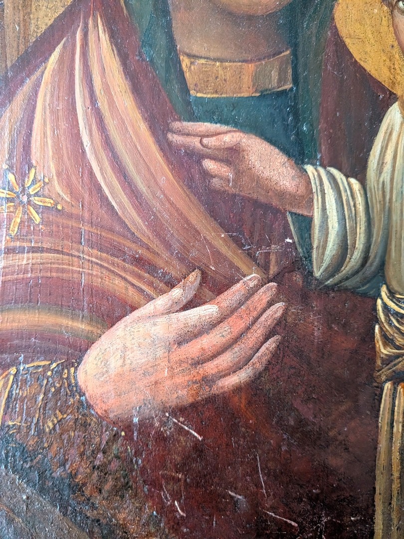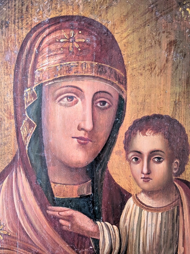 Gottesmutter mit Christuskind, 18./19. Jahrhundert, griechische Ikone. Diese Ikone zeigt ein klassisches Motiv der orthodoxen Ikonographie: Die Gottesmutter mit dem Christuskind. Dieses Motiv gehört zur Typusgruppe der "Hodegetria", bei der die Muttergottes mit der rechten Hand auf das Kind weist - als Zeichen, dass Christus der Weg zum Heil ist. Die Darstellung ist in Eitempera mit Naturpigmenten auf einem Holztafel mit leicht gewölbter Oberfläche ausgeführt. In den oberen Ecken sind griechische Buchstaben zu sehen: links: ΜΡ (Μήτηρ), rechts: ΘΥ (Θεοῦ). Diese Kürzel bedeuten: "Mutter Gottes" - ein traditionelles Merkmal orthodoxer Ikonen. Altersbedingte Krakelee und kleine Farbverluste sind am Rand zu sehen - typisch für eine Ikone mit liturgischem Gebrauch.
