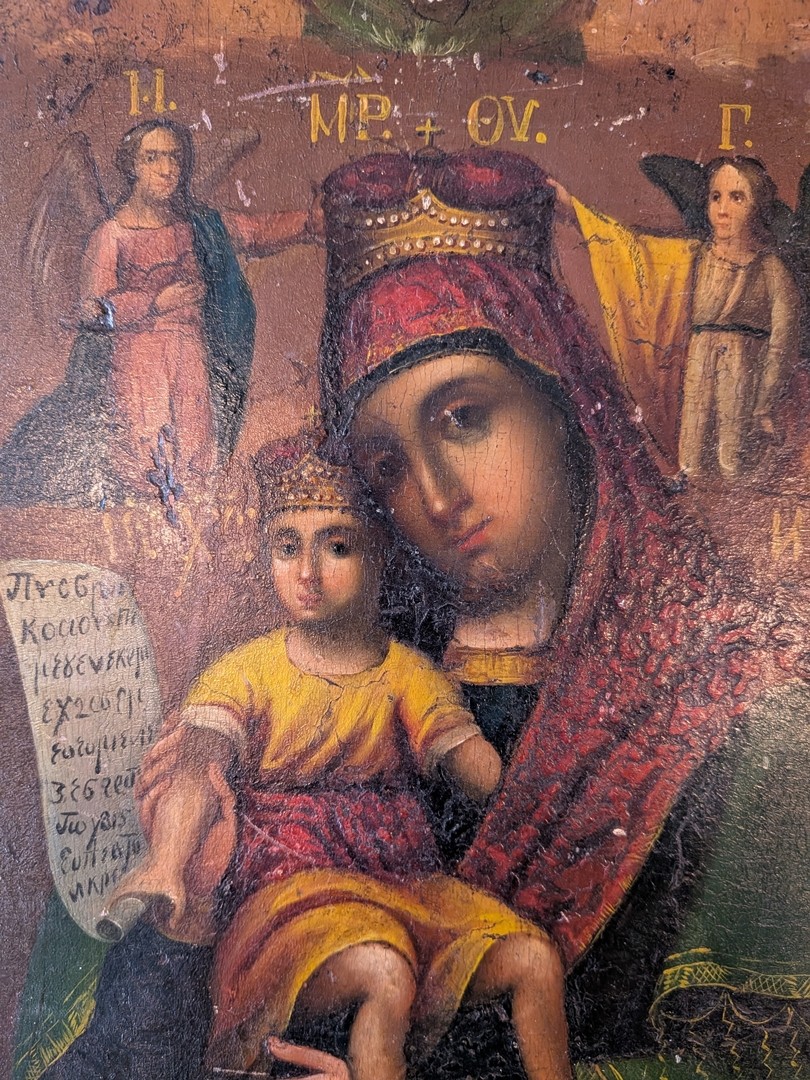 Gottesmutter mit dem Jesuskind, 18./19. Jahrhundert, griechische Ikone. Die Ikone zeigt die Gottesmutter mit dem Jesuskind, umgeben von Engeln und dem segnenden Gottvater in der oberen Bildmitte. Die Inschrift "МР ΘΥ" (griechisch abgekürzt "Mutter Gottes") bestätigt, dass es sich um eine Marienikone handelt. Die Darstellung ist mit Eitempera auf Holz ausgeführt und teilvergoldet. Die Farbschicht ist Teils abgerieben aber gut erhalten.