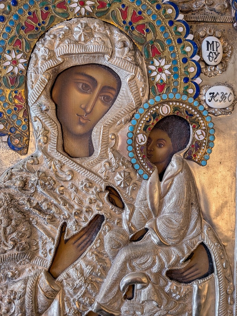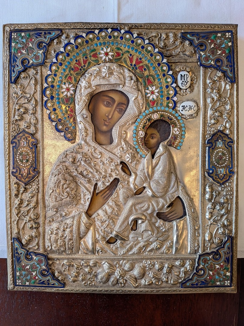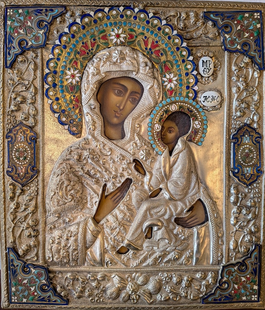 Gottesmutter mit dem Jesuskind, 19/20. Jahrhundert, russische Ikone. Die Ikone zeigt die Jungfrau Maria mit dem Jesuskind im Arm. Beide Figuren haben Heiligenscheine mit kunstvoller Ornamentik. Die griechischen Buchstaben "ΜΡ ΘΥ“ stehen für Meter Theou - "Mutter Gottes", "ΙC XC“ steht für Iēsous Christos - "Jesus Christus". Der Oklad (Metallverkleidung) ist fein getrieben und teilweise emailliert. Die Gesichter, Hände und Füße des Jesuskinds sind mit Eitempera auf Holz gemalt.