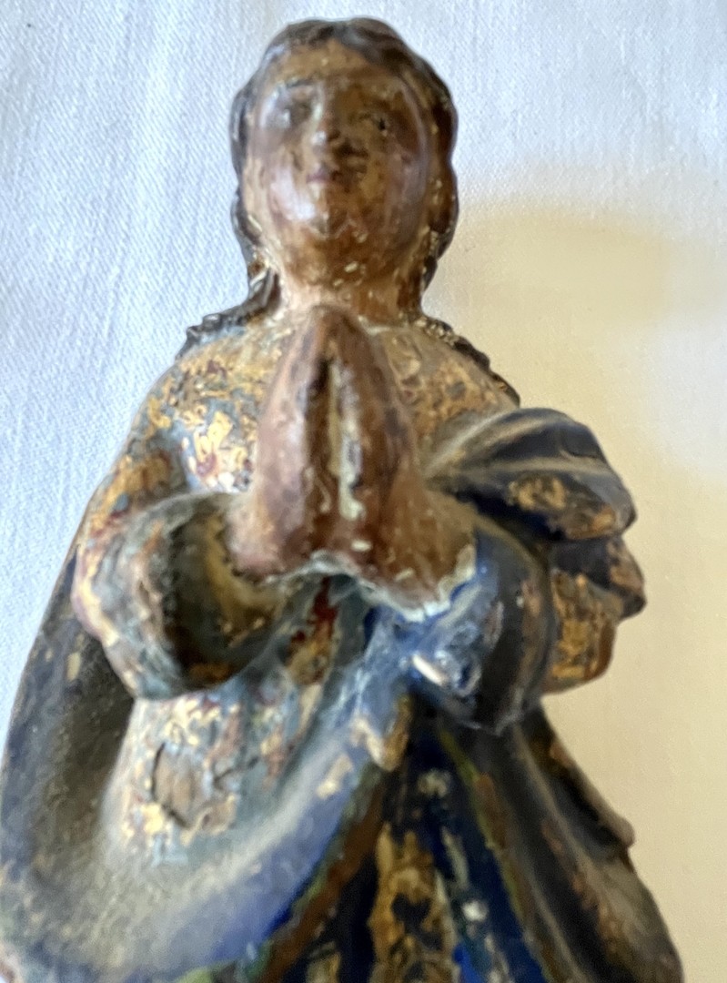 Maria Immaculata, Holz, handgeschnitzt, 18./19. Jahrhundert. Mit Wandsockel, polychrome Bemalung.