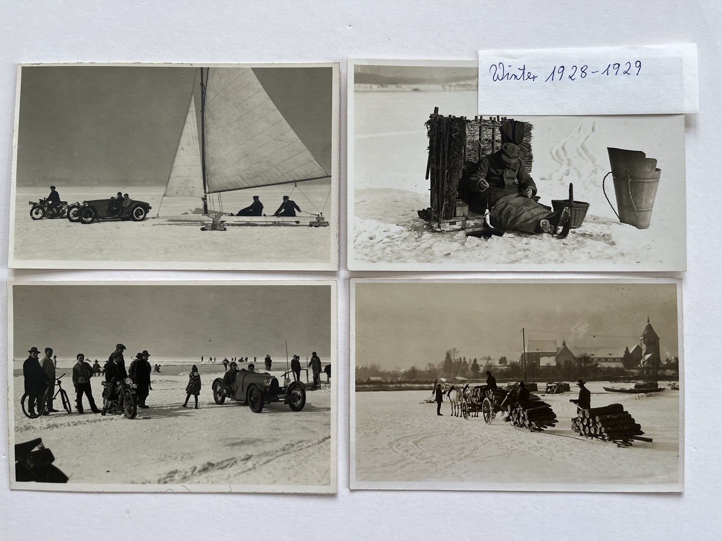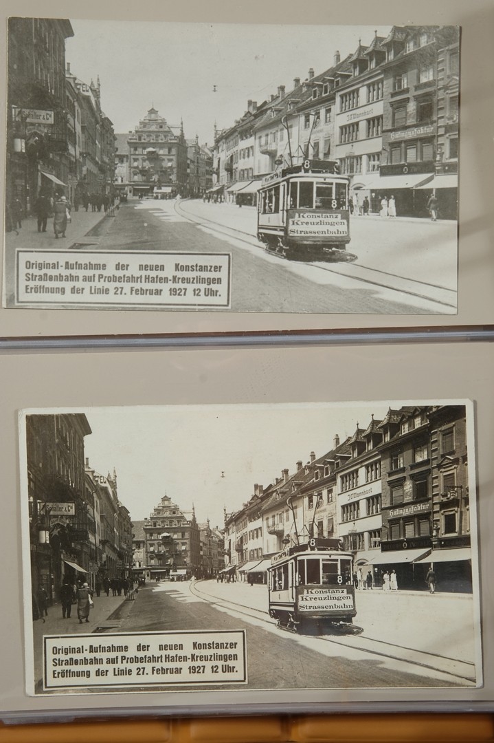 Besondere Karten: Fotos vom zugefrorenen Bodensee im Winter 1928/29. Fotomontage mit folgendem Text: „Original-Aufnahme der neuen Konstanzer Straßenbahn auf Probefahrt Hafen-Kreuzlingen Eröffnung der Linie 27. Februar 1927 12 Uhr.“ Diese S-Bahn hat es nie gegeben. Die Fotomontage verrät sich, da die notwendige Oberleitung, ohne die keine S-Bahn fahren kann, fehlt.