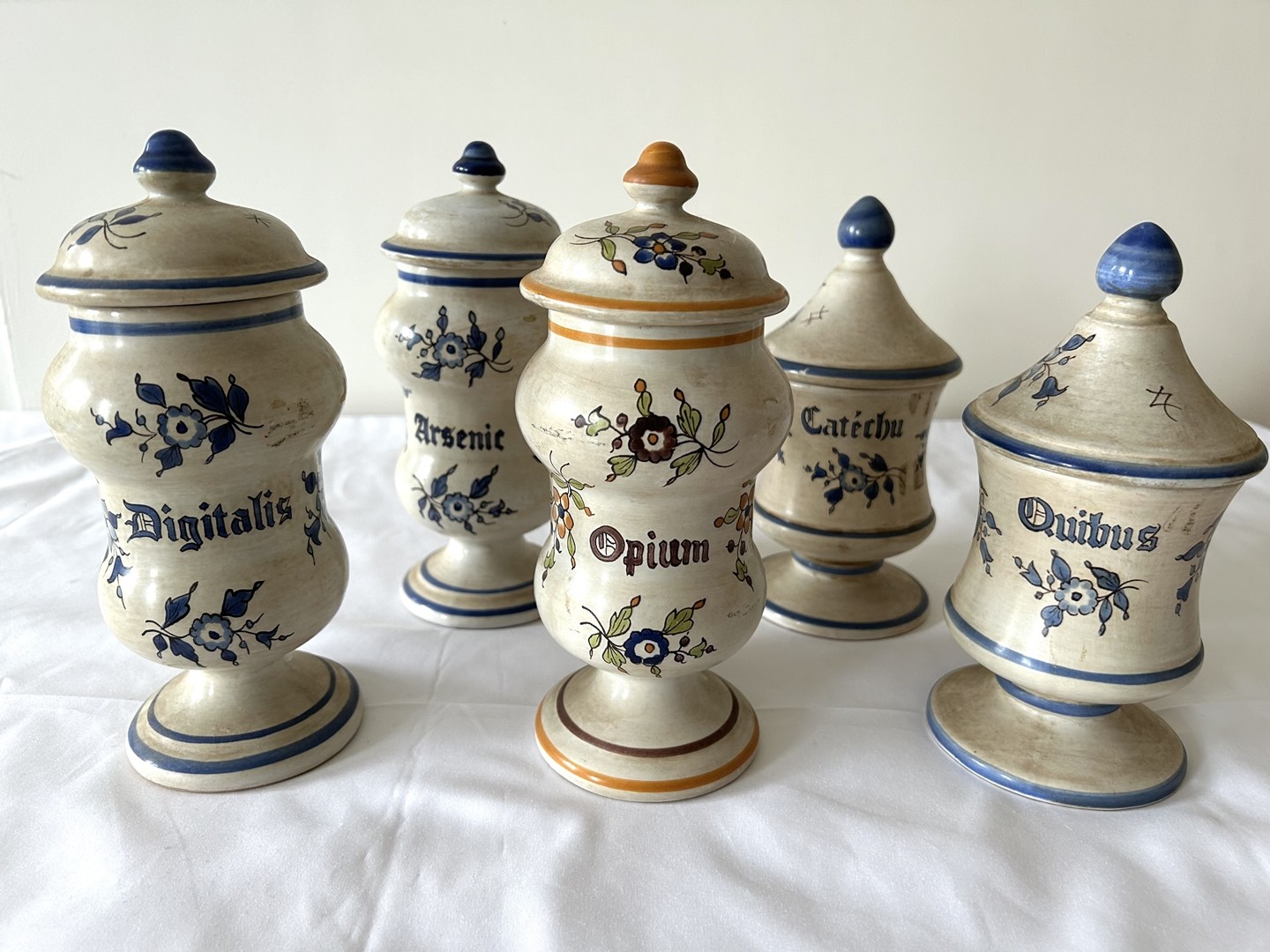 Die fünf Gefäße sind beschriftet mit "Digitalis","Quibus", "Catéchu", "Arsenic" und "Opium". Weiß-beige Engobe mit floraler Bemalung. Das Opium-Gefäß ist im Gegenzug zu den blaugehaltenen anderen Gefäßen in einem zarten Orange gehalten.