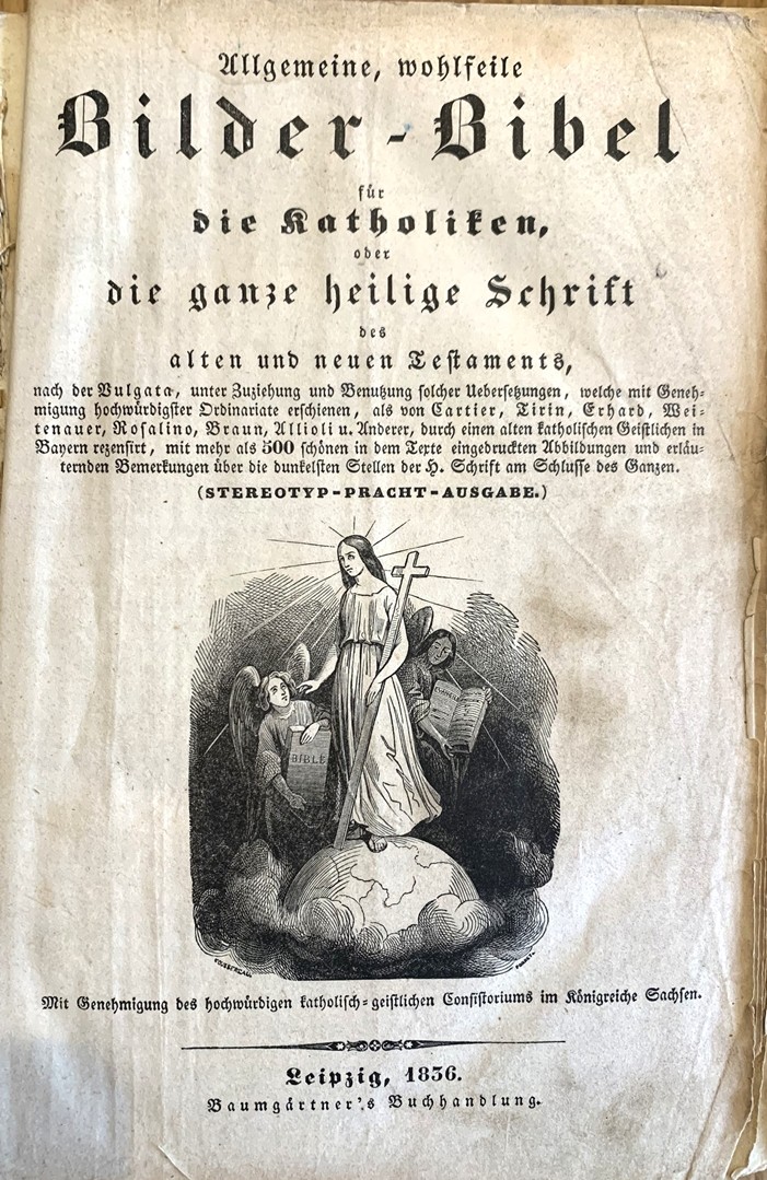 "Allgemeine, wohlfeile Bilder-Bibel für die Katholiken", Baumgärtner, 1836. 24 x 16 x10 cm.