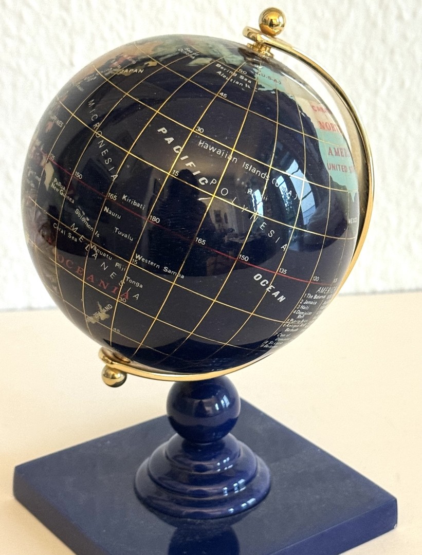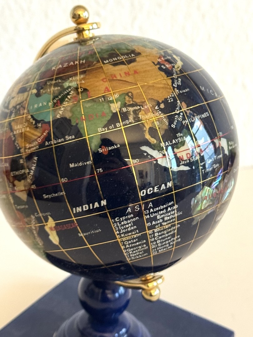 Schmuckvoll gefertigter Globus aus unterschiedlichen Edelsteinen und Perlmutt-Dekor auf blauem Sockel. Die Länder werden durch verschiedene Edelsteine akzentuiert, mit Messingintarsien als Längen- und Breitengrade.