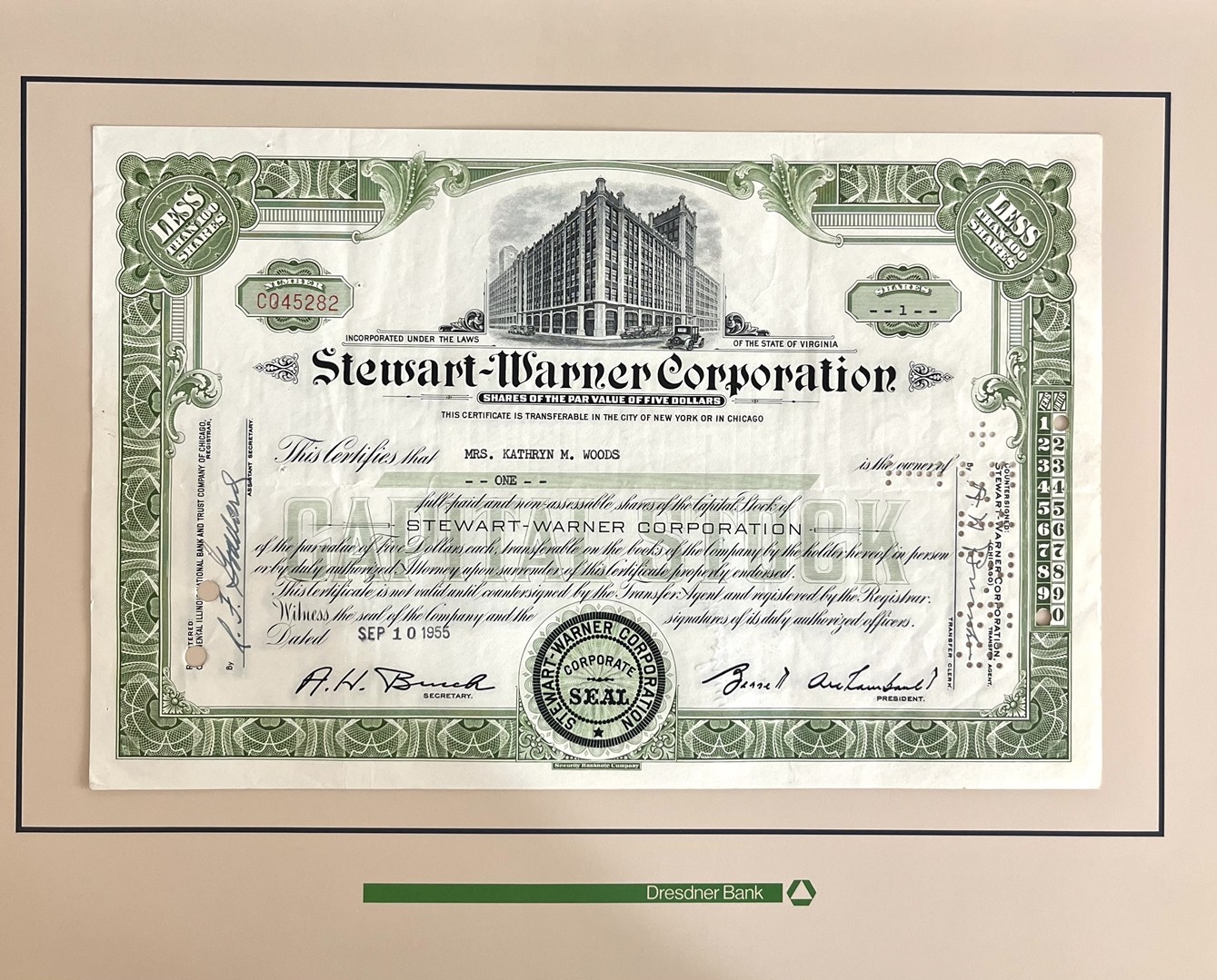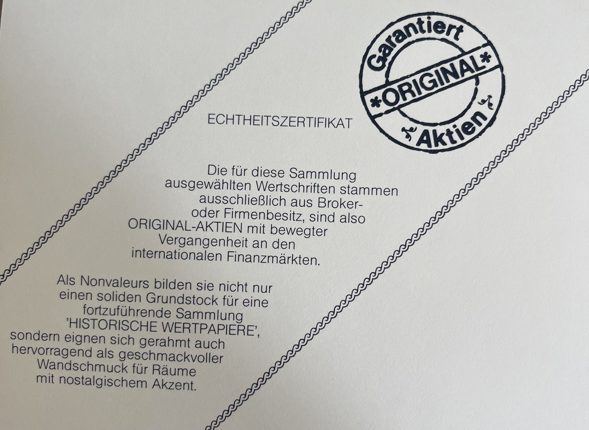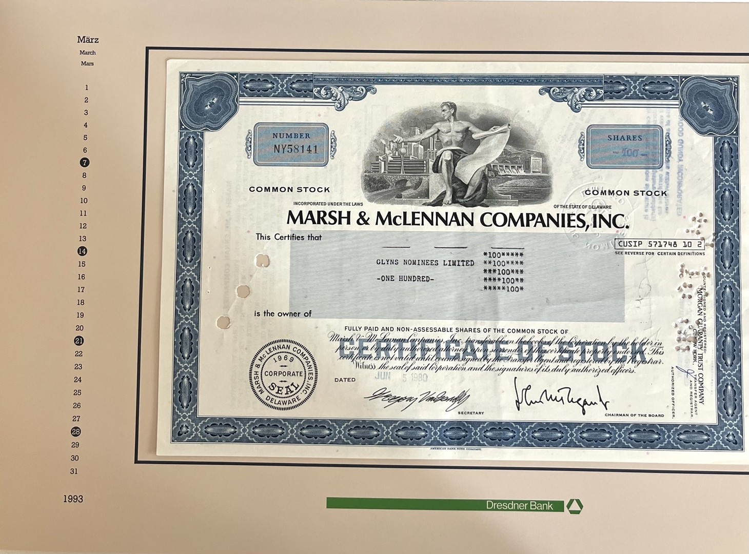 Los 58 - Kalender "Historische Wertpapiere 1993", Dresdner Bank. Sammlerstück verschiedener Wertpapiere in Form eines Kalenders aus dem Jahr 1993. Original-Aktien der internationalen Finanzmärkten mit Echtheitszertifikat. Diese stammen ausschließlich aus Broker- oder Firmenbesitz.