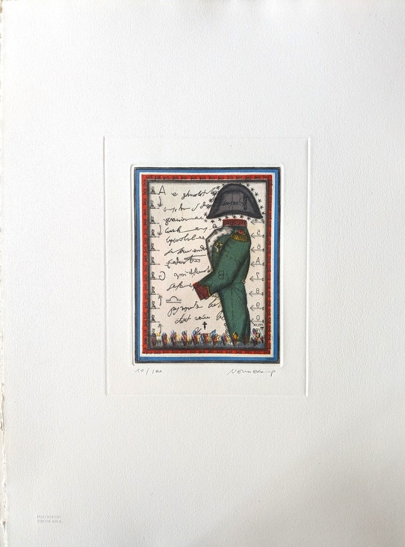 Los 77 - Vennekamp, Johannes (geboren 1935) "Der Newton der kleinen Köper oder Das Ding unterm Hut. Ein Lesebuch des XIX. Jahrhunderts" 1979, Buch und zehn Radierungen. Ein Lesebuch des 19. Jahrhunderts, von Johannes Vennekamp gesammelt und bebildert. Dazu zehn Farbradierungen, jeweils rechts unten signiert und links unten nummeriert.