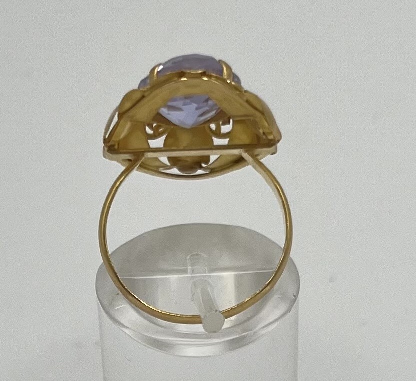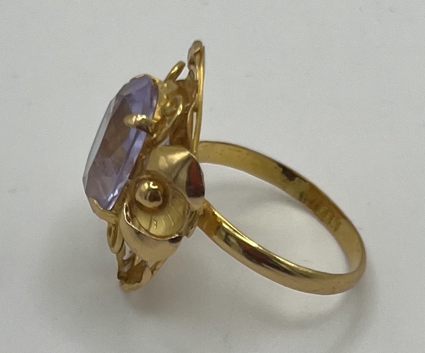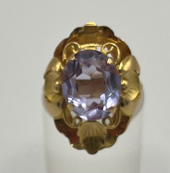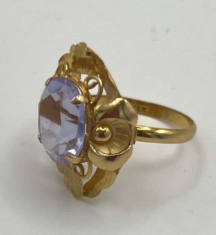 Los 293 - Amethyst Ring, 916 Gelbgold, Größe 53. Ornamentale Goldfassung, mit Blattverzierung. In dieser Fassung ein ovaler Amethyst. Altersbedingt leichte Kantenabnutzung, Gesamt 3,62g.