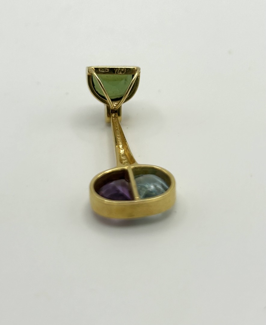 Anhänger, 750 Gelbgold, mit Peridot, Aquamarin und Amethyst. Länglicher Anhänger mit drei Steinen, die symmetrisch angeordnet sind.