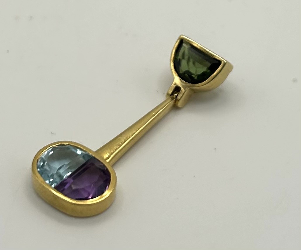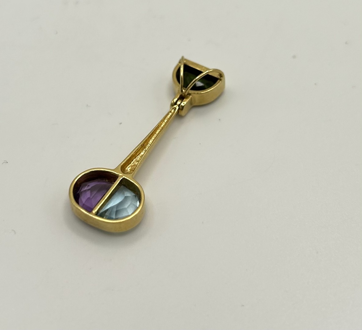 Los 153 - Anhänger, 750 Gelbgold, mit Peridot, Aquamarin und Amethyst. Länglicher Anhänger mit drei Steinen, die symmetrisch angeordnet sind.