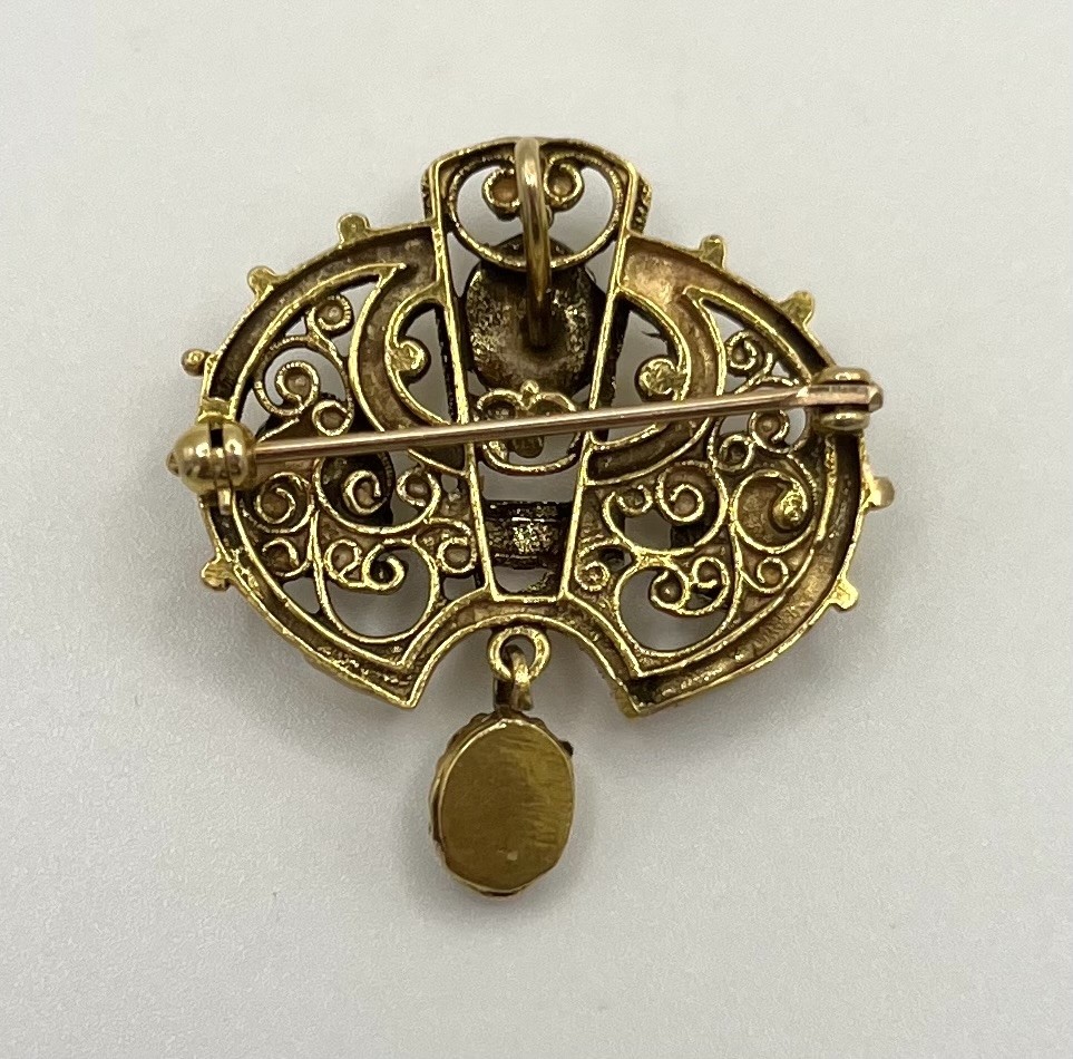 Anhänger/Brosche im Jugendstil, vergoldet, mit vier Opalen und vier kleinen Biwaperlen. Filigran gearbeitet - ein echter Hingucker.