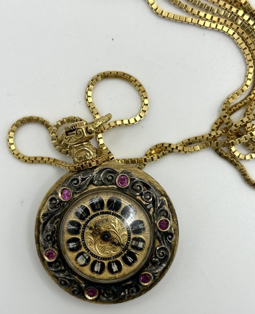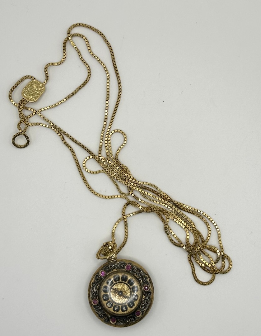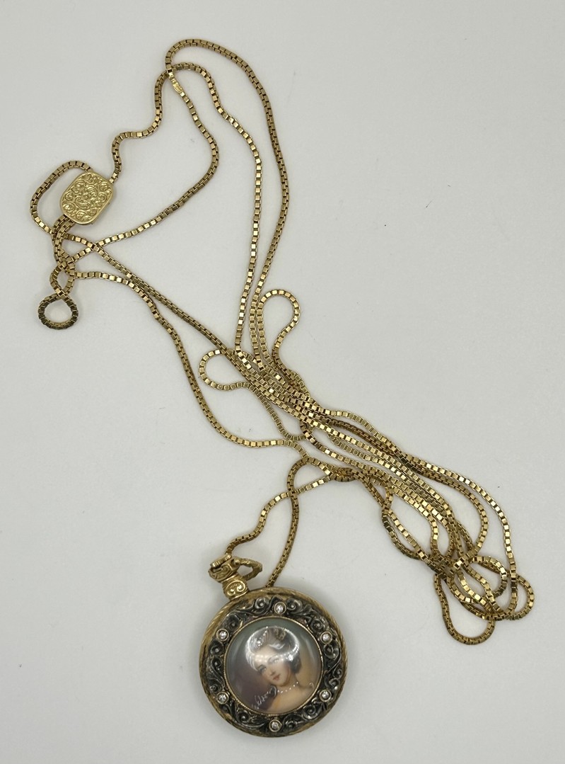 Los 162 - Anhänger mit Miniaturgemälde und Taschenuhr, an doppelter Kette. Feines Miniaturgemälde mit Signatur, diese unleserlich. Taschenuhr konnte nicht geöffnet werden, Funktion ungeprüft. Römische Ziffern.