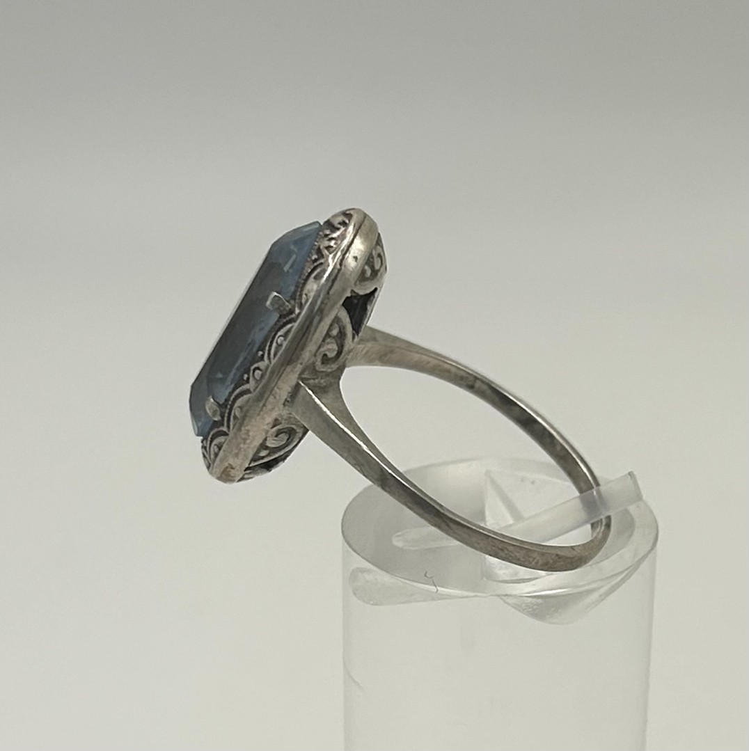 Los 270 - Aquamarin Ring, Silber getestet, Größe 60. Filigraner Ring mit mittig eingesetztem, ovalen Aquamarin.