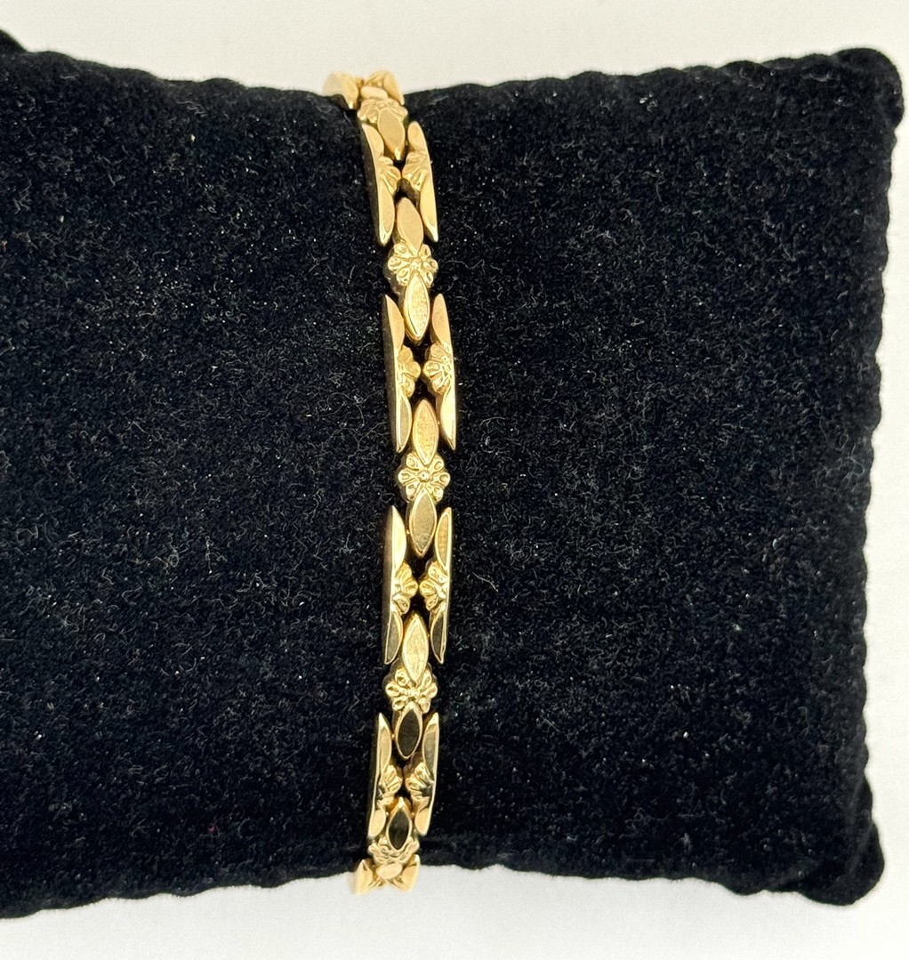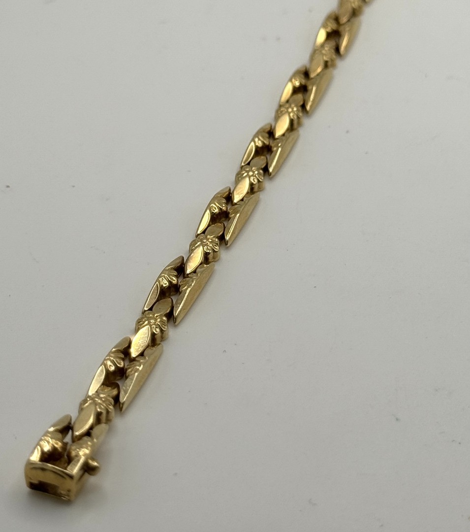 Los 174 - Armband, 585 Gelbgold, Gegliedert im Blütendesign. Schlichtes Armband mit Blütengliedern. Steckverschluss mit Sicherheitsacht.