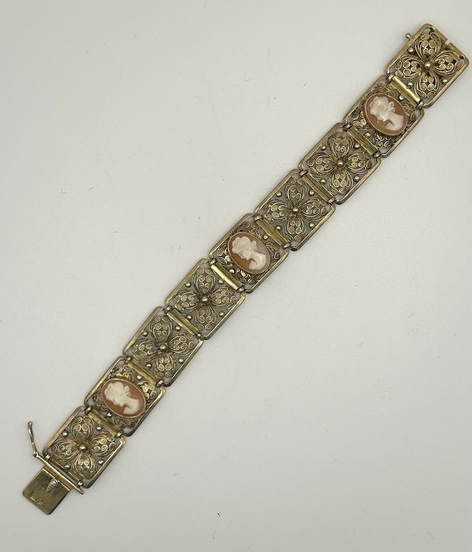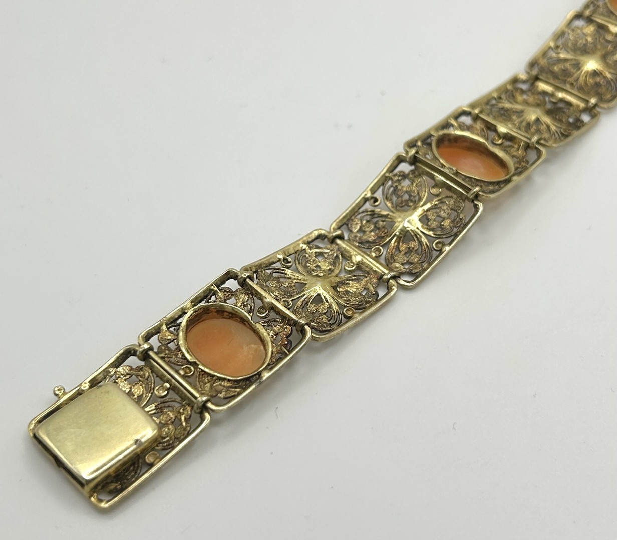 Armband, 800 Silber, mit Muschelcamée, vergoldet, um 1920. Neun quadratische Elemente ausgeführt als Blüten in wunderbarer filigraner Goldschmiedekunst. Drei Elemente zusätzlich mit Muschelcamée besetzt. Steckverschluss mit Sicherheitsacht.