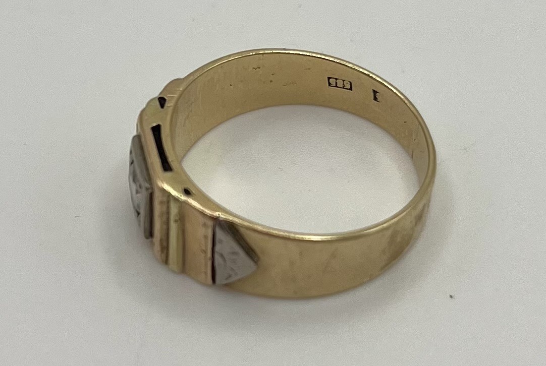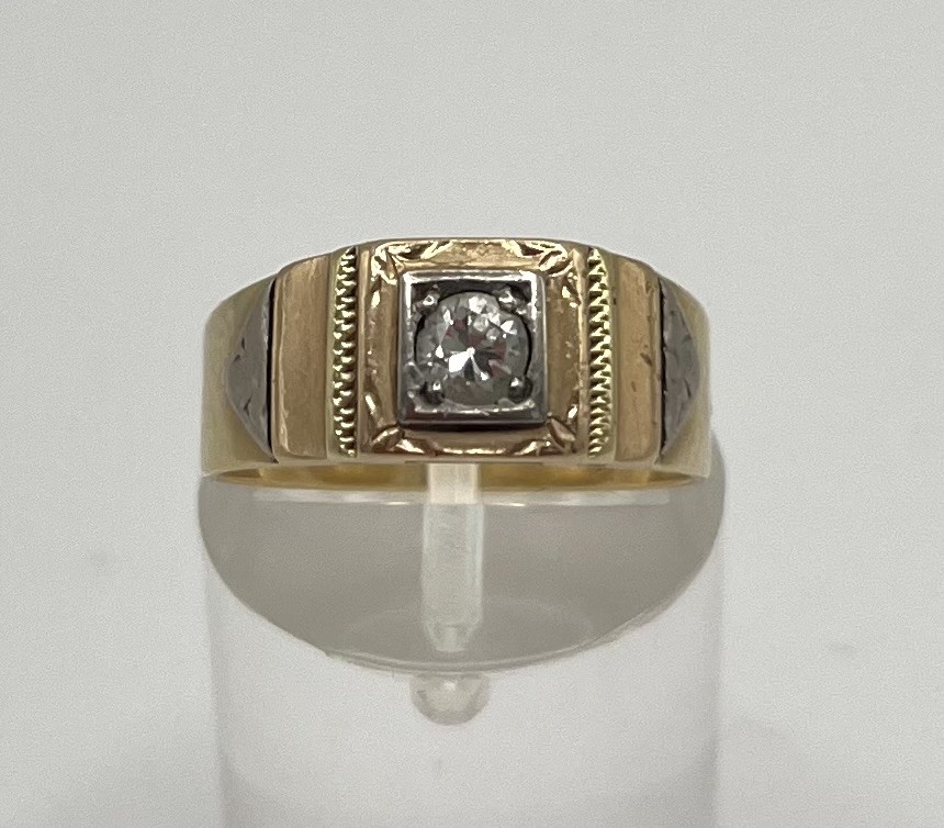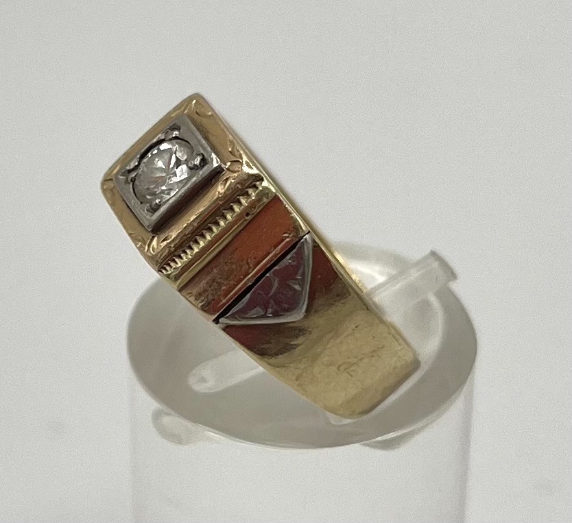 Los 279 - Brillantring, 585 Gelbgold, Brillant um 0,1ct, Größe 53. Schön gearbeiteter Ring mit Bicoloren Elementen und mittigem Brillanten.