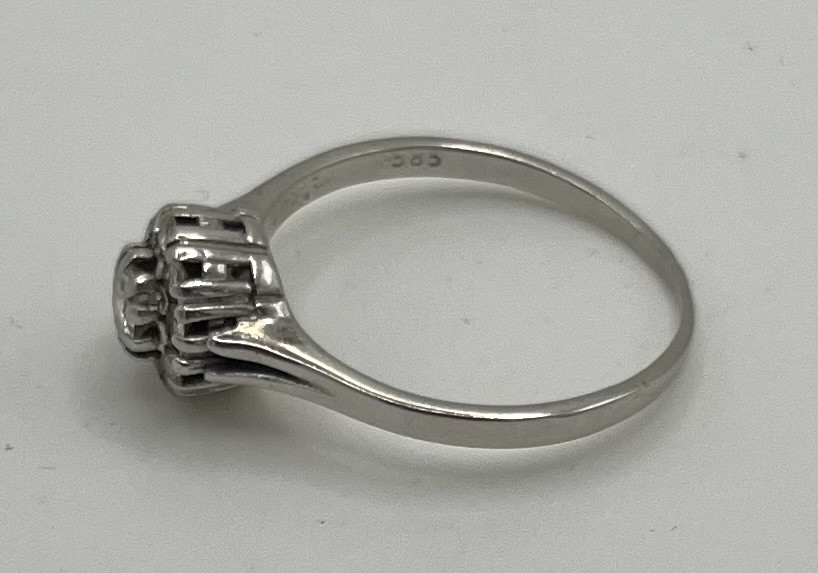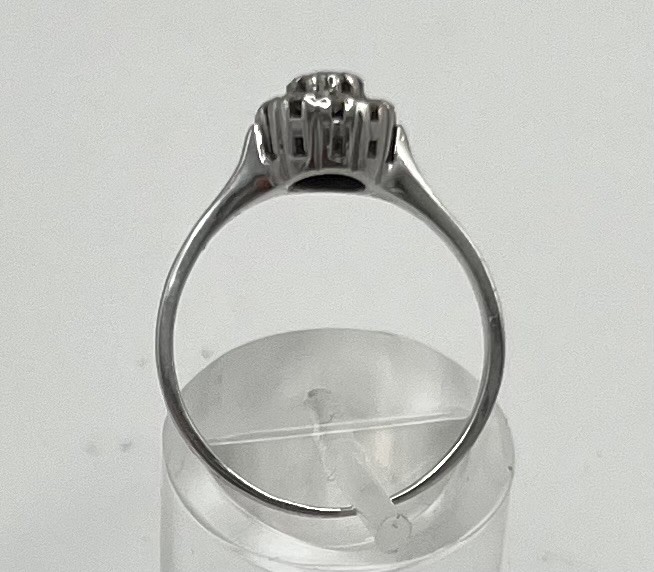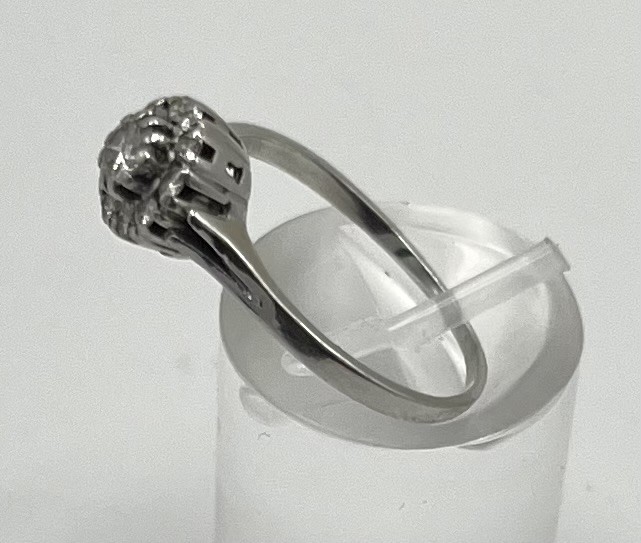 Los 181 - Brillantring, 585 Weißgold, mittiger Brillant um 0,15 ct, Größe 55. Mittiger Brillant wird von weiteren zehn Brillanten umrandet. Klassisches und zeitloses Schmuckstück.