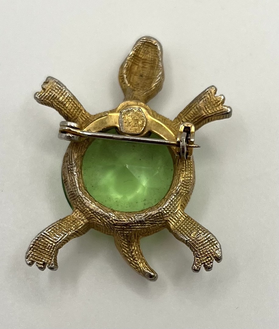 Brosche, in Form einer Schildkröte mit großem hellgrünen Saphir, vergoldet. Auf dem Kopf der Schildkröte die Augen als kleine Rubine und vier kleine Brillanten.