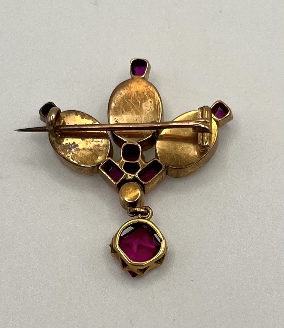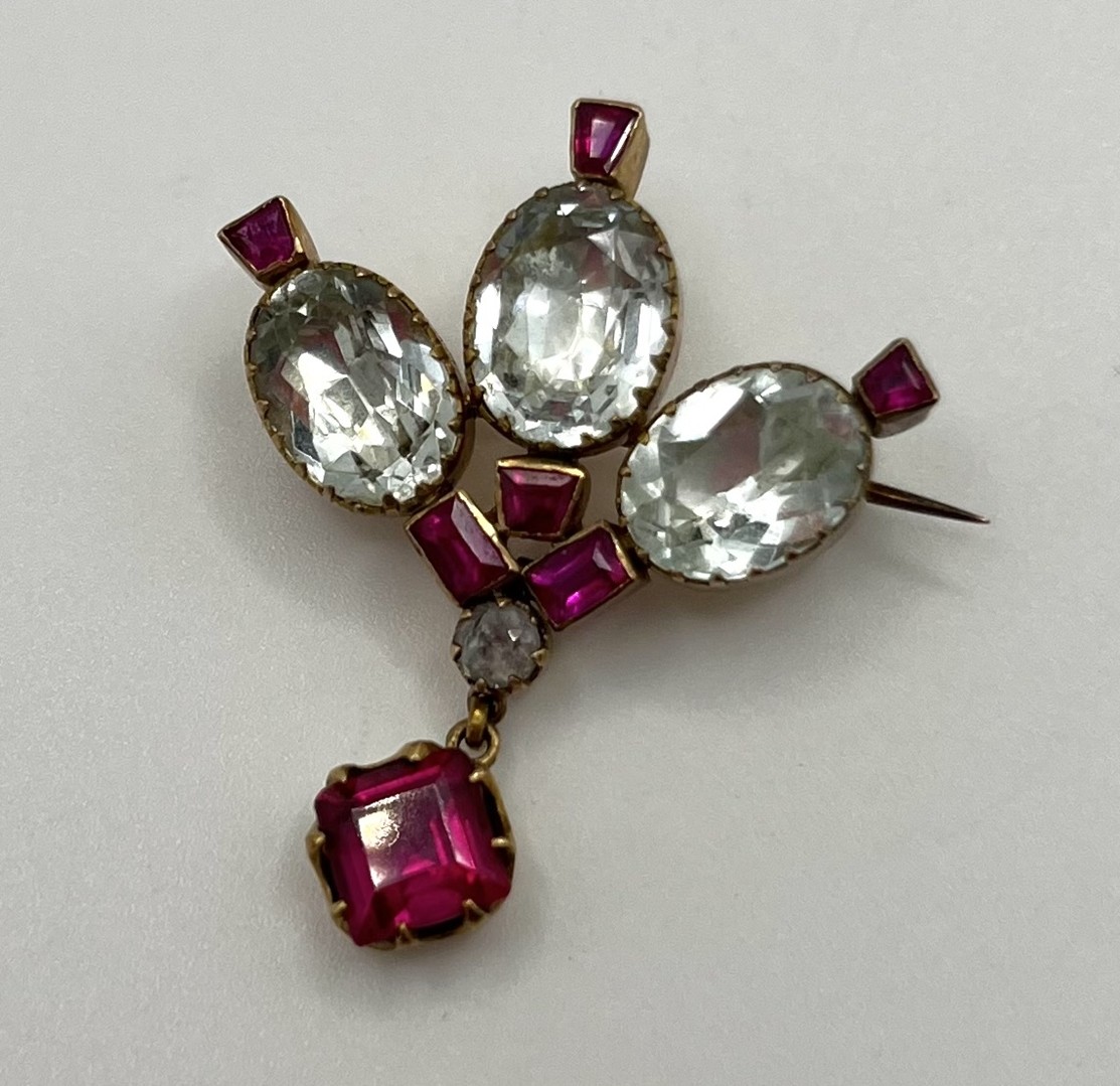 Brosche, mit verschiedenen Schmucksteinen, vergoldet. Aufgefächertes Design mit drei mittig angelegten weißen Steinen, außen verschiedene rote Steine.