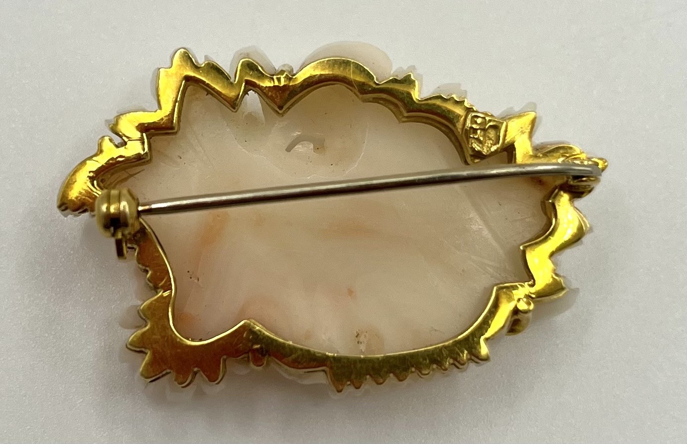 Los 187 - Brosche, weiße Koralle, 750 Gelbgold, 30er Jahre. Geschnitzt als Körbchen mit Blumeneinlage.