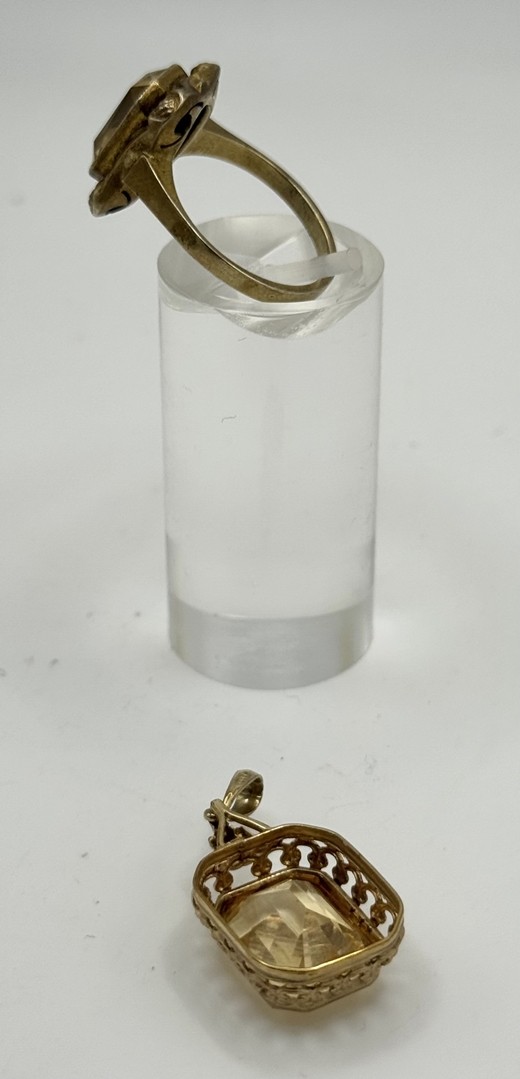 Los 238 - Citrin Konvolut, Anhänger und Ring, 835 Silber und 333 Gelbgold, Ringgröße 53. Rechteckiger Citrin in ornamentalen Fassungen eingelassen.