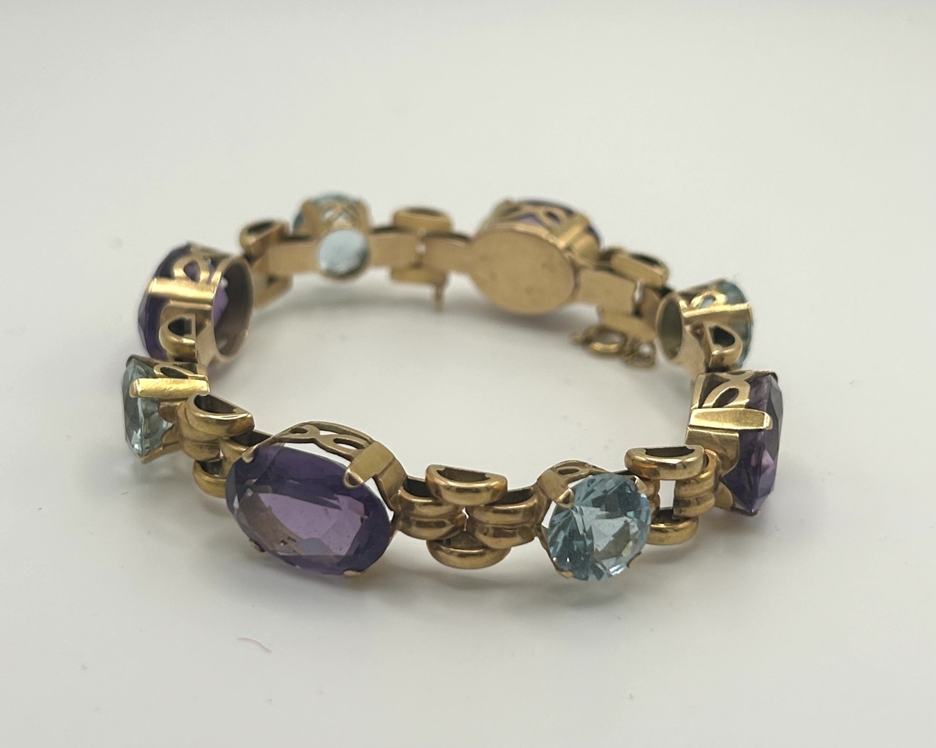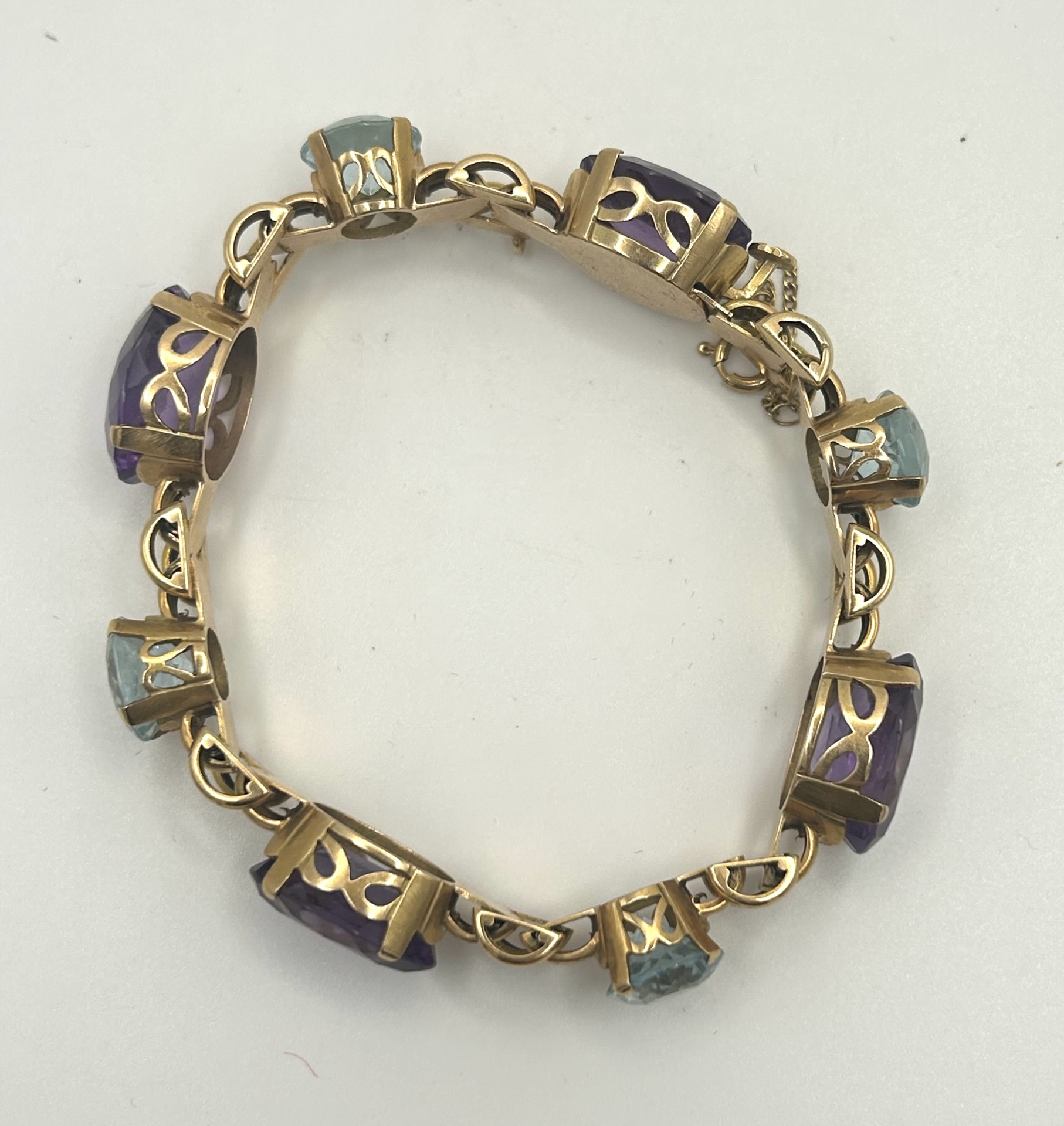 Los 169 - Goldarmband, mit grünen und lila Amethysten gefasst, 750 Gelbgold. Fein gearbeitetes Armband, besetzt mit abwechselnd gefassten, facettierten Amethysten in grün und violett. Durch offene Seitenpartien der Fassungen, wird der Lichteinfall und somit das Leuchten der Steine betont. Die Glieder sind beweglich gearbeitet. Steckverschluss mit Sicherheitsacht.