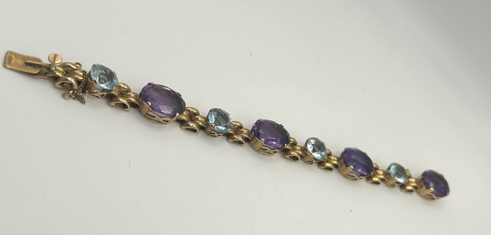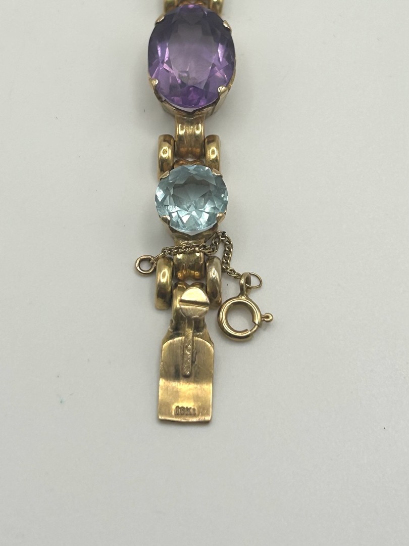 Goldarmband, mit grünen und lila Amethysten gefasst, 750 Gelbgold. Fein gearbeitetes Armband, besetzt mit abwechselnd gefassten, facettierten Amethysten in grün und violett. Durch offene Seitenpartien der Fassungen, wird der Lichteinfall und somit das Leuchten der Steine betont. Die Glieder sind beweglich gearbeitet. Steckverschluss mit Sicherheitsacht.