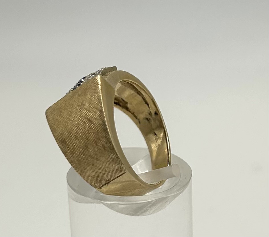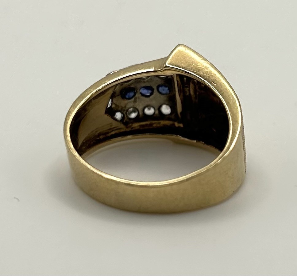 Goldring, 585 Gelbgold, mit neun Brillanten und drei Saphiren, diese je um 0,03ct, Größe 50. Moderner Ring mit geometrischer Applikatur. Auf einer Seite ebenfalls in geometrischer Form die Steine angelegt.