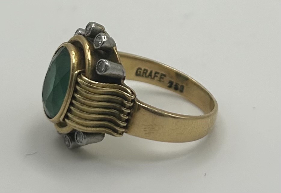 Goldring, 750 Gelbgold, mit Turmalin und acht Brillanten, Größe 53. Ovaler Turmalin in Goldfassung eingelassen, oben und unten von jeweils vier Brillanten umrandet.