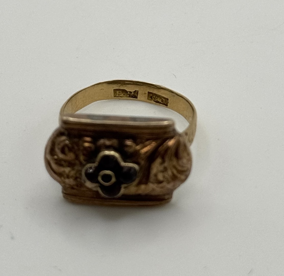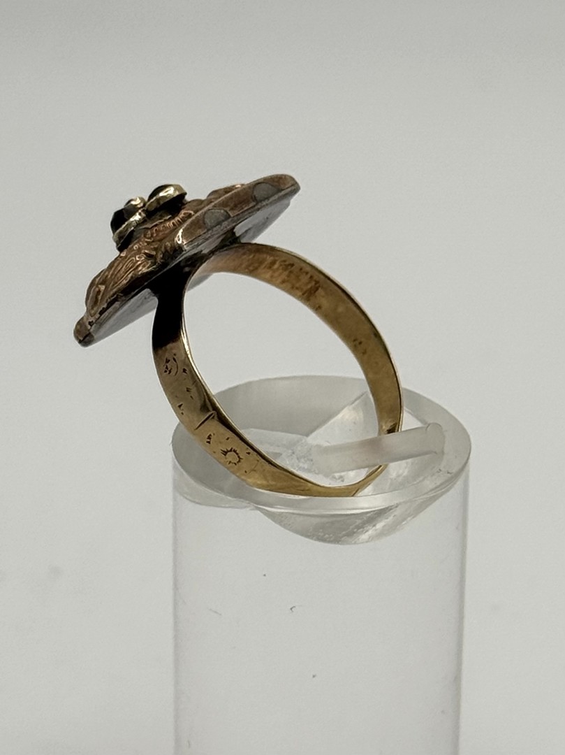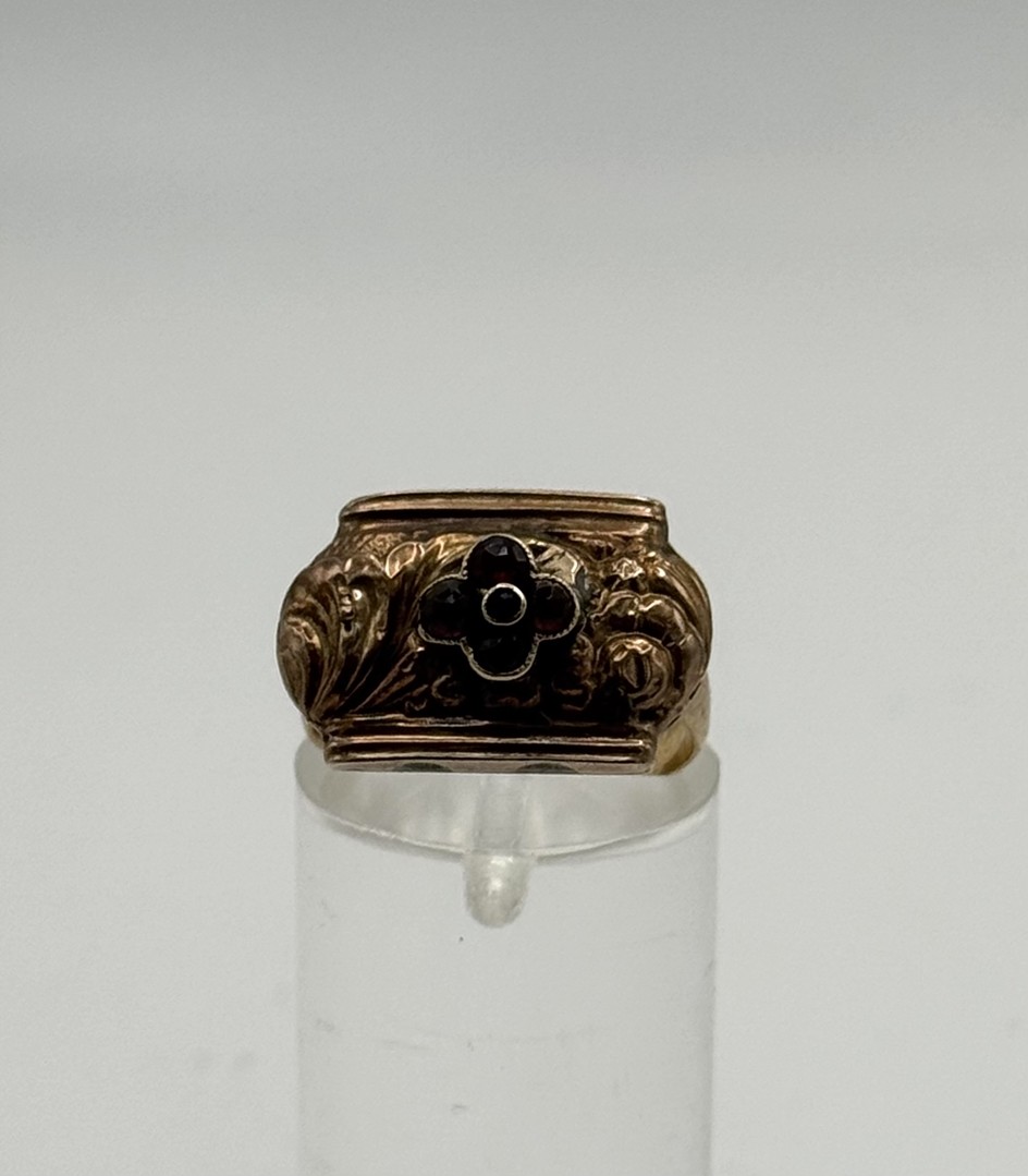 Der markante, erhabene Ringkopf fasst vier Rubinen, die um den zentralen kleinen Rubin angeordnet sind. Darum rankt sich ein florales Muster.