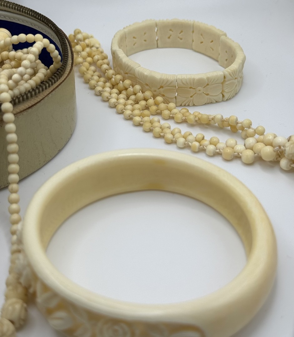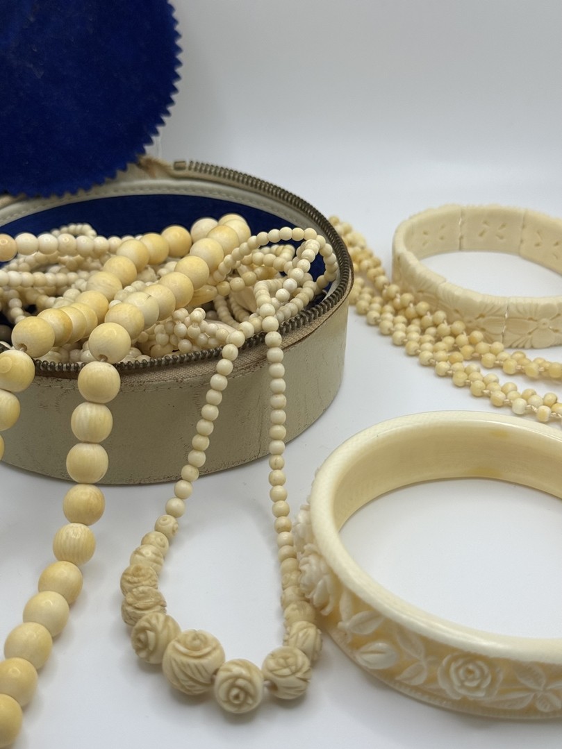 Modeschmuck Konvolut, Bein, Ketten, Armreifen, paar Ohrstecker. Feine Schnitzereien.