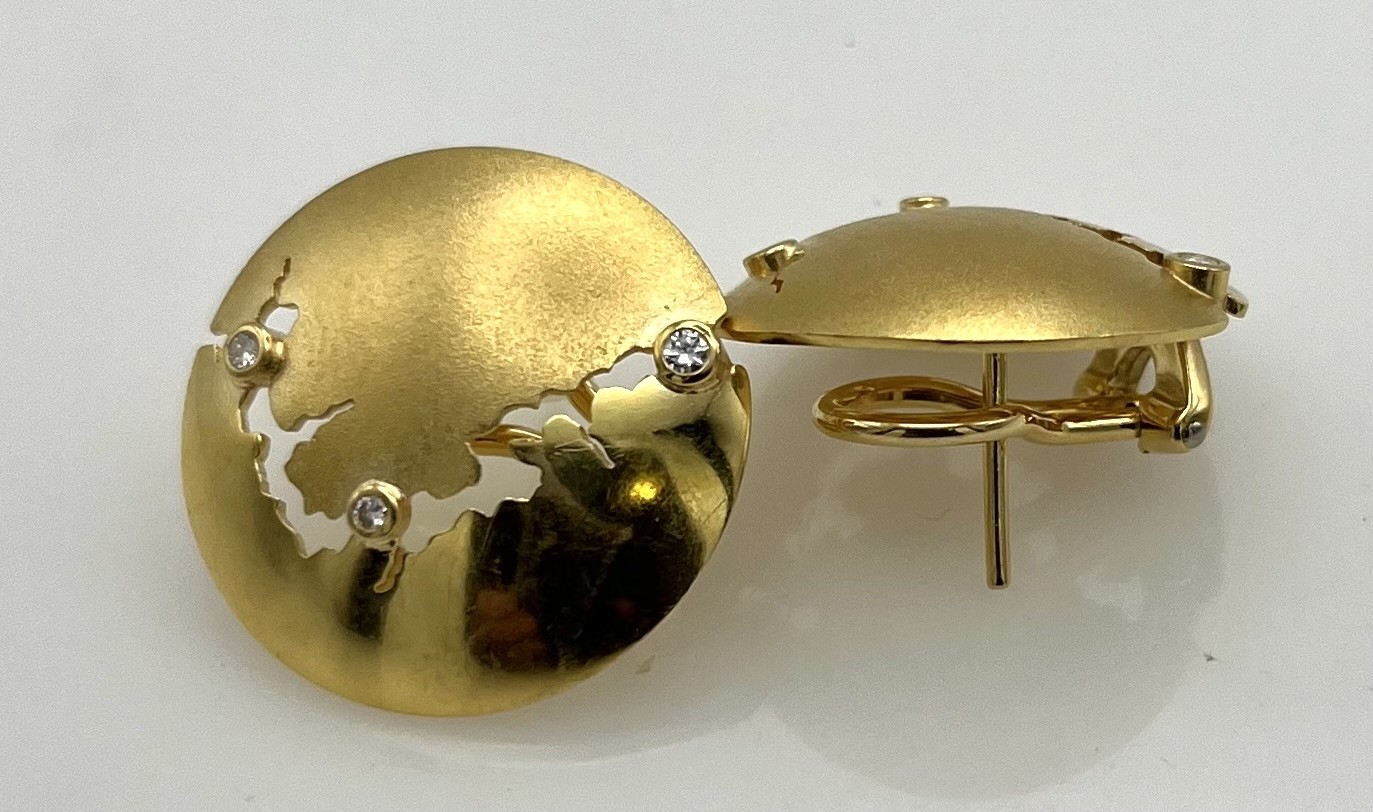 Brillanten insgesamt um 0,1ct (tw / if). Schöne Atelierarbeit mit durchbrochenen Stellen an den runden Ohrclips. In diesen liegen jeweils drei Brillanten. Die durchbrochene Stelle schneidet den Clip in eine Matte und eine glänzende Seite. Durchmesser Ohrclip ca. 2,3 cm. Goldschmiedemarke.